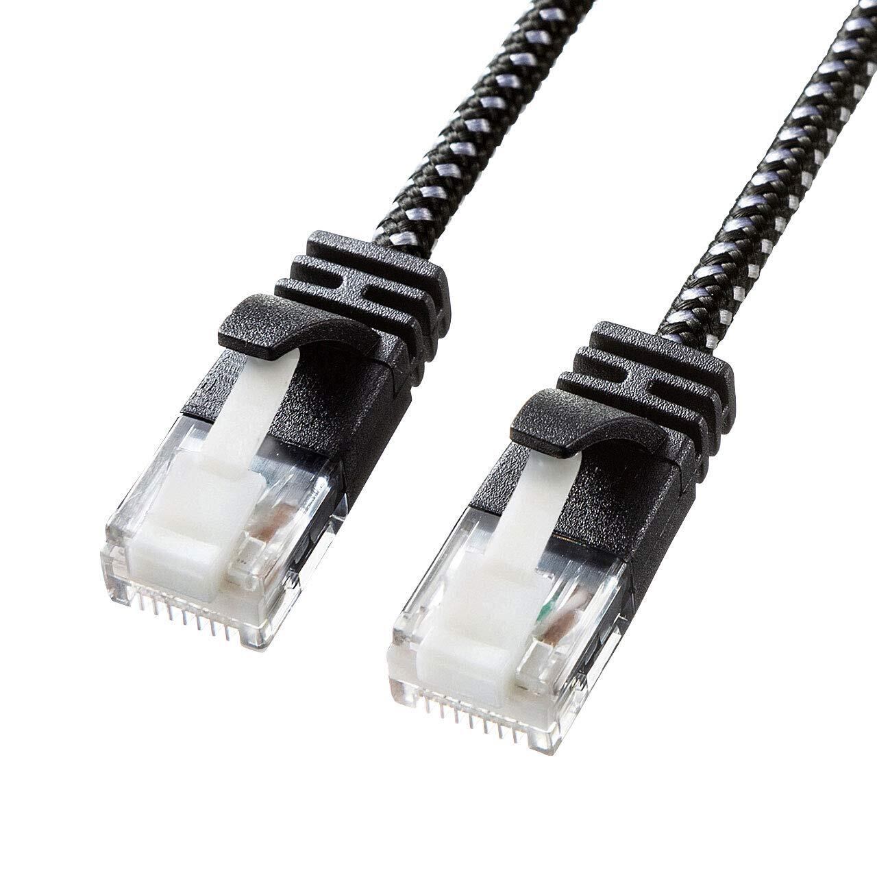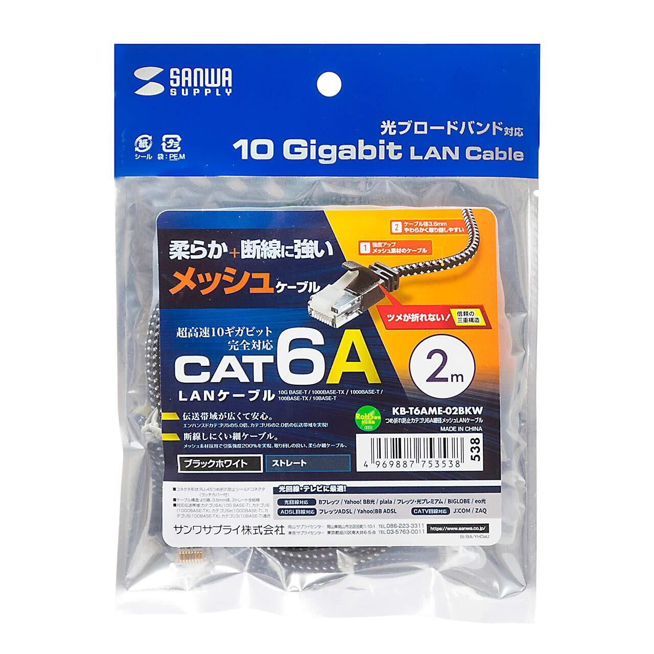 サンワサプライ CAT6A細径メッシュLANケーブル モデム用 (2m) 10Gbps/500MHz RJ45 ツメ折れ防止 ブラック&ホワイト KB-T6AME-02BKW