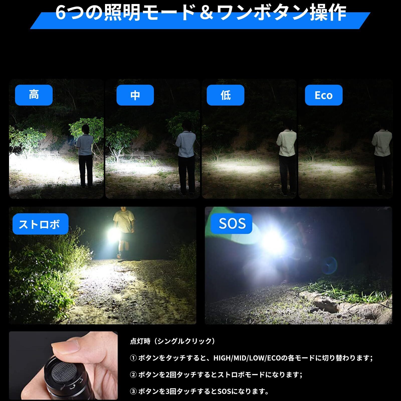 【用途に合わせて6つモード】用途に合わせてWUBEN C3懐中電灯は4つの調光モード付いています。エンド部分のボダンを押して、HIGH-MID-LOW-ECOモードを順番に切り替わります。また、ボダンを連続2回半押してストロボ(STROBE)に入ります。連続3回半押してSOSモードに転換します。