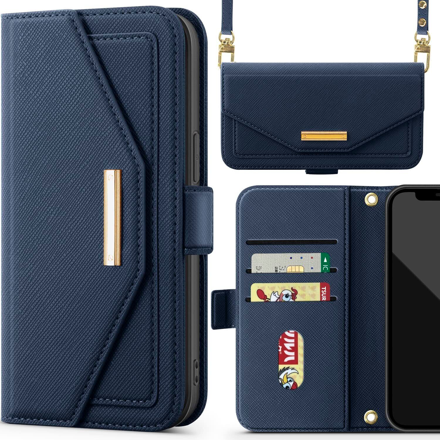 NODALA iPhone 12 Mini ケース 手帳型 アイフォン12ミニ スマホケース 財布型 ショルダー あいふぉん12Mini 携帯ケース 肩掛け 斜めがけ カバー 手帳型 小銭入れ カード収納 ロングストラップ 長さ調節可能 ミラー付き女性 おしゃれ 横置 ステント機能 折りたたみ 耐衝撃 PUレザー ブルー