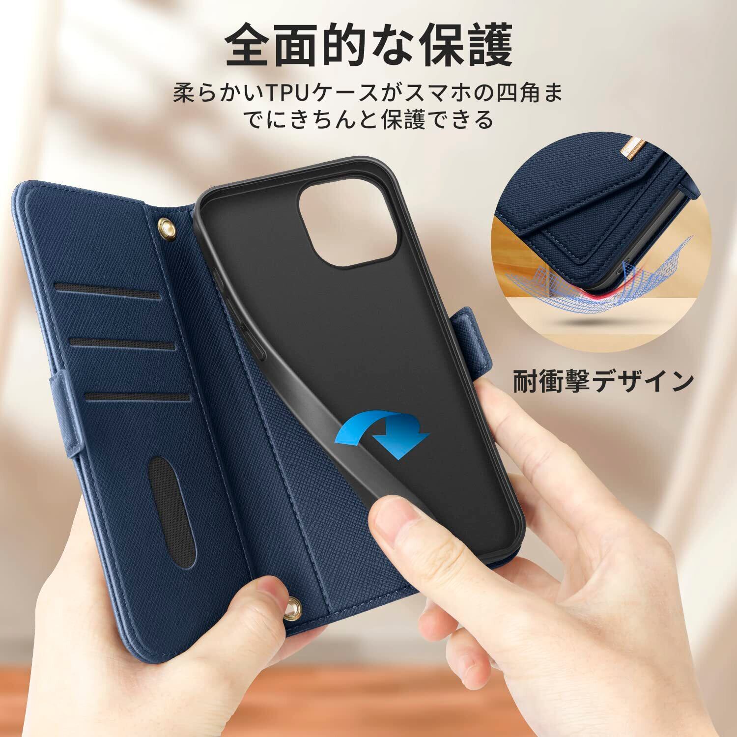 【高級PUレザー】アイフォン12mini財布型ケース外装はPUレザー、内装は衝撃吸収性の高いTPU素材を使用し、各コーナーの内側には精密なデザインを施し、仕上がりは丁寧でスタイリッシュな仕上がりになっています。指紋や皮脂が簡単に落とせるので、洗う必要がなく、濡れたペーパータオルで拭くだけでOKです。