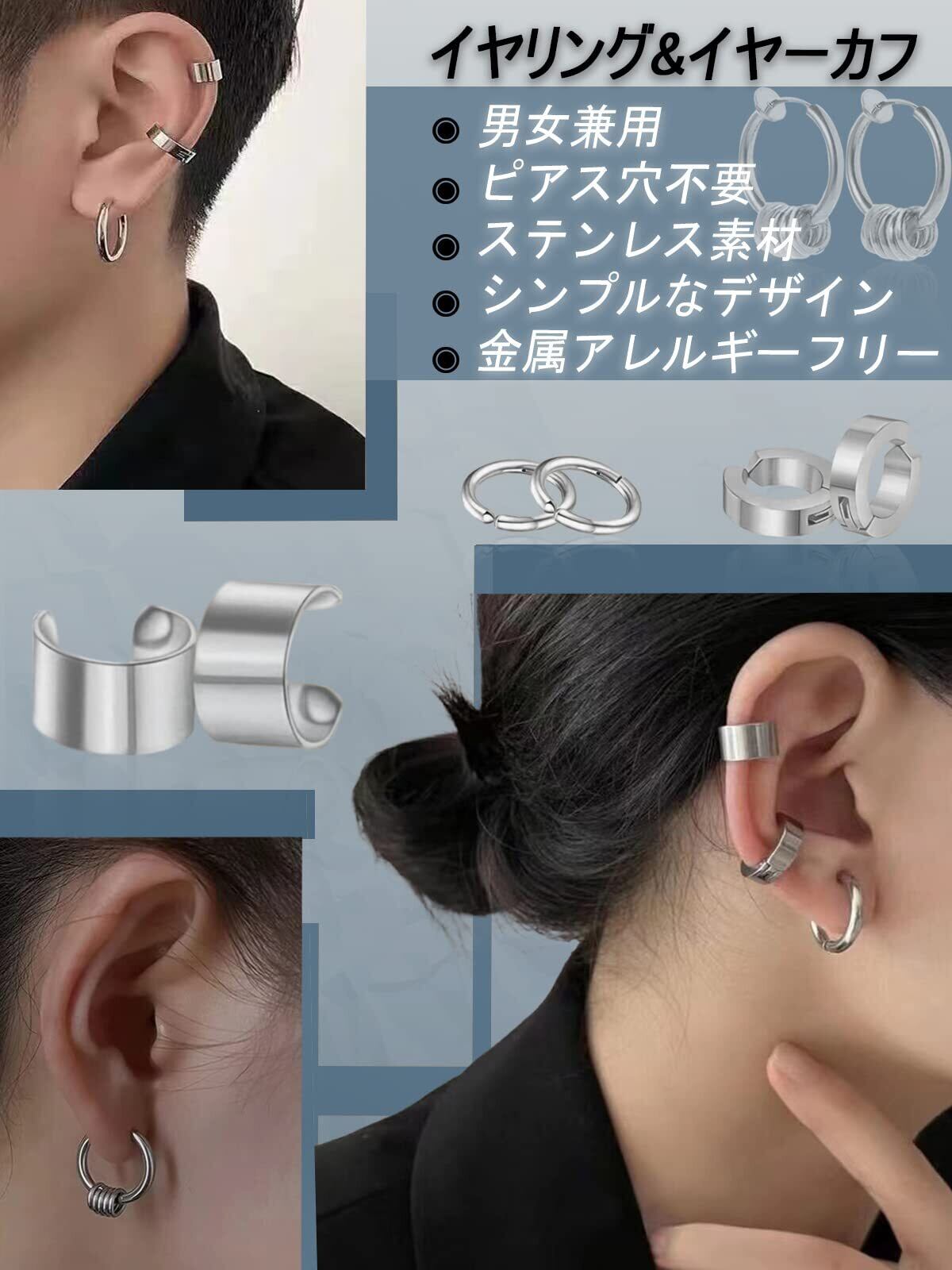 【ピアス穴がいらないフェイクピアス 】ピアス穴を開ける必要のない耳に挟むフープピアスタイプのイヤーカフ・ノンホールピアスです。耳に挟んでとめるだけで簡単に装着でき、普通のピアスと変わらない見た目で周りから疑われることなくフェイクピアスを存分に楽しんで頂けます。ピアス穴開けるのを躊躇している方、平日職場や学校の関係で、イヤリングが禁止されている職場人、ジュニア、学生にぴったりピアスセットです。