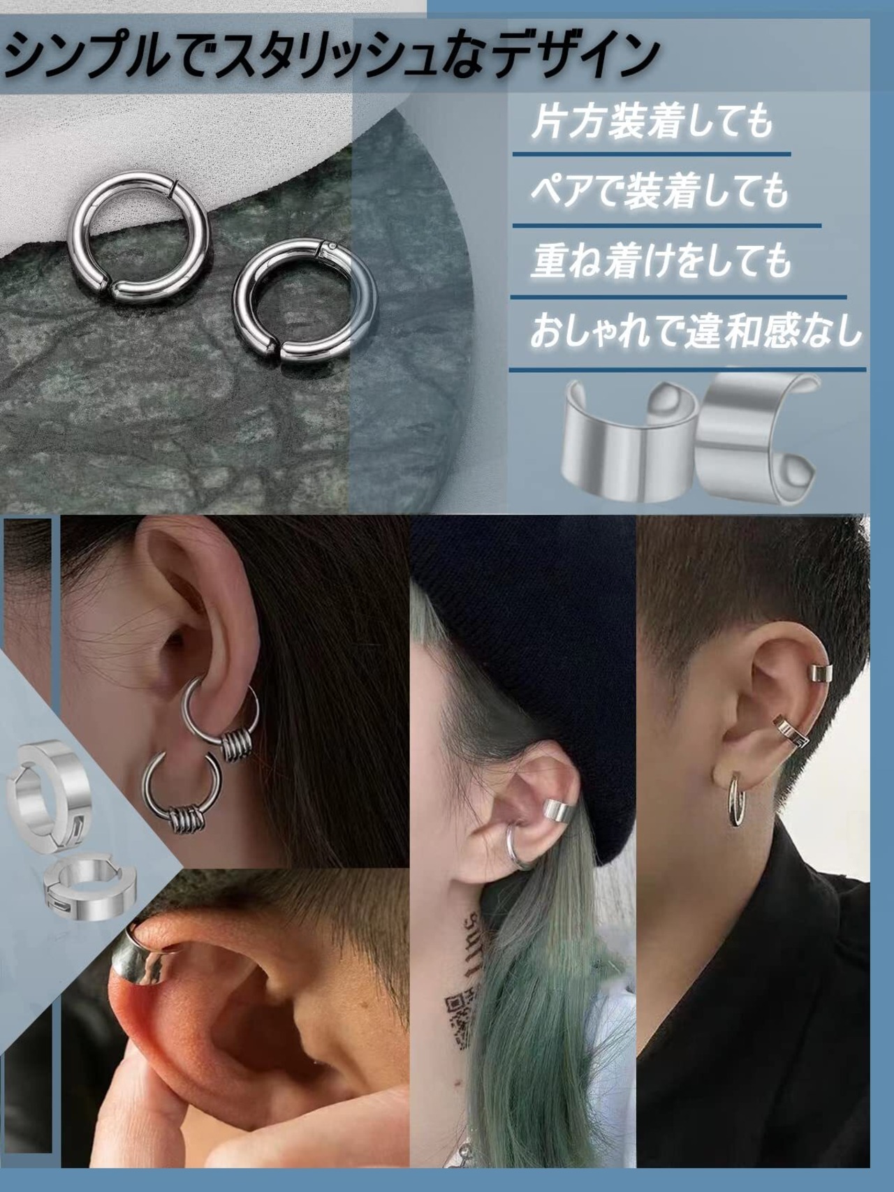 【人気のイヤリング】フェイクピアスタイプなので耳に穴を開ける必要がなく、メンズもレディースもファッションシーンで使い回しやすいです。ユニセックスデザインなので、イヤリングをペアでつけたり、片耳だけ付けたり、重ね付けたり、軟骨ピアスとして、色違いで付けたりして付け方法が色々あります。