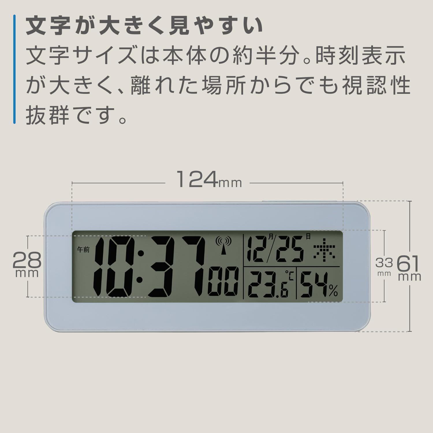 サイズ:6.1×15×3.8cm 質量:150g 使用電源:単4形アルカリ×2本(電池別売) 材質:プラスチック枠 ムーブメント:電波時計 機能:電子音アラーム スヌーズ&アラームオートストップ 温度表示(-9.9~59.9℃) 湿度表示(20~95%) カレンダー表示(2099年12月31日まで表示可能) 12(午前/午後)/24時間表示切替 残照機能ライト 最大数字サイズ(縦)2.8cm
