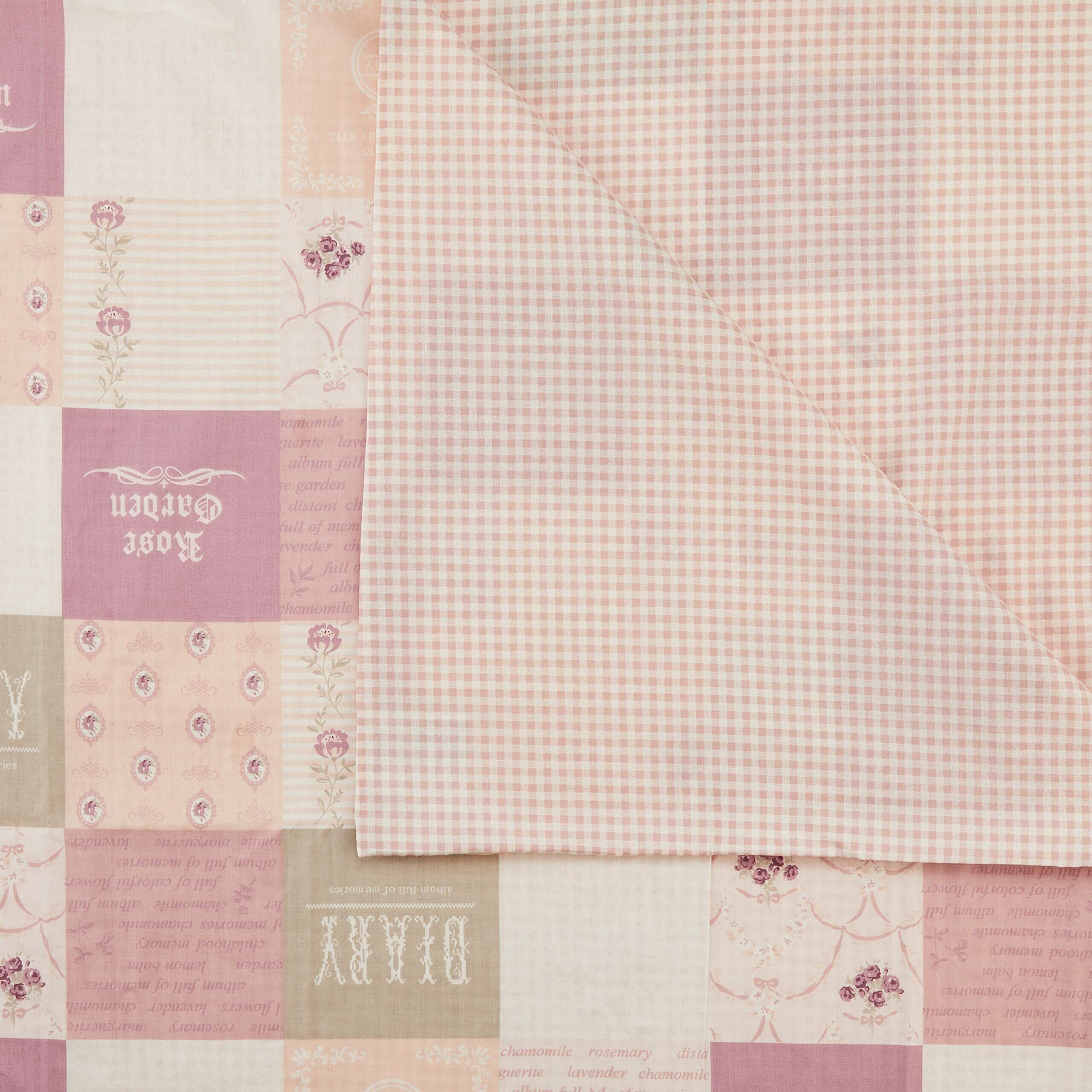 カバーの表面はアンティーク感漂う英文字とフラワーモチーフのパッチワーク調プリント柄、カバーの裏面はギンガムチェック柄とリバーシブルで使えます。