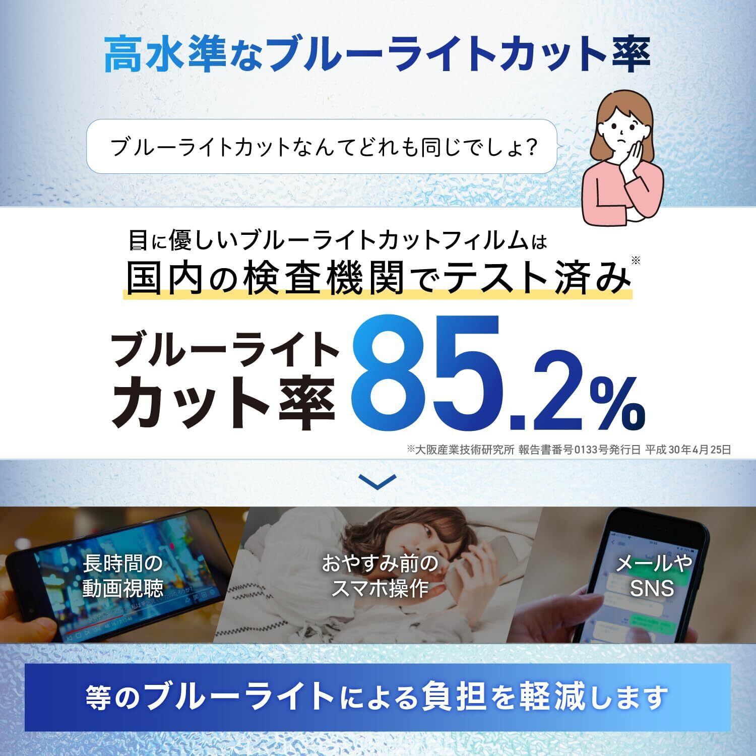 【 目に優しい ブルーライトカット 】 日本製強化ガラス(旭硝子)を使用した硬度10Hのガラスフィルムにブルーライトカット機能を追加し、UV紫外線(200-380nm)を98%カット。ブルーライト危険域(特に紫外線に一番近い380-410nm)は85.2%としっかりカット。ブルーライト域全体(380-500nm)でも26.4%カットします。