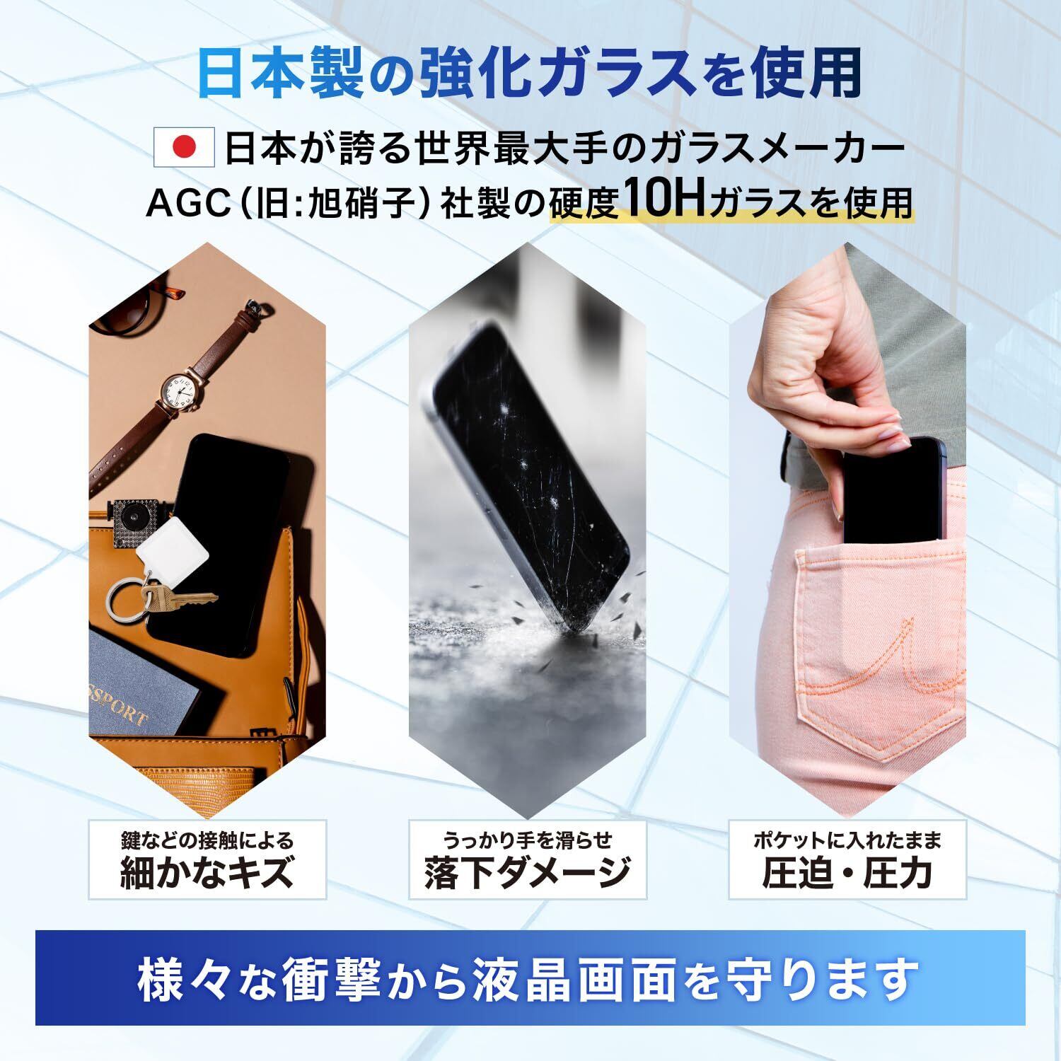 【 液晶割れを徹底ガード 】 硬度10Hで液晶割れを徹底ガード。硬度10Hなら落下はもちろん、鍵などと一緒にバッグに入れても傷がつきません。万が一の破損時も、飛散防止加工によって破片が飛び散ることがなく安全です。