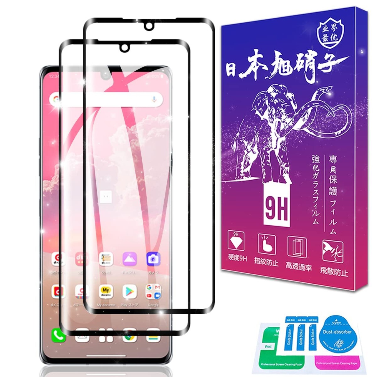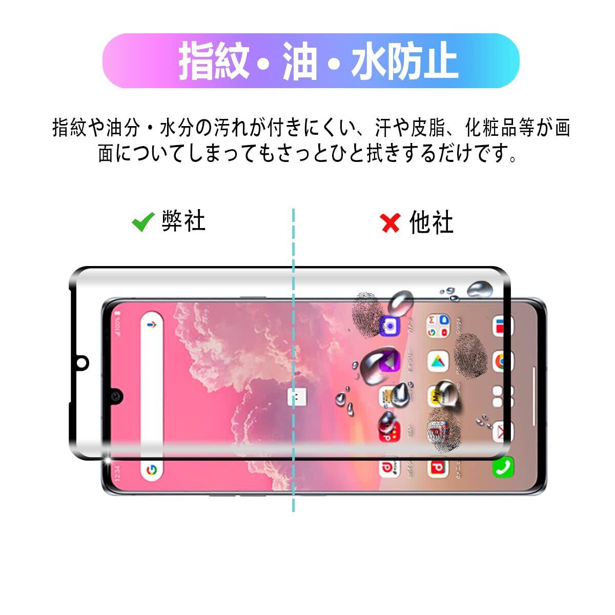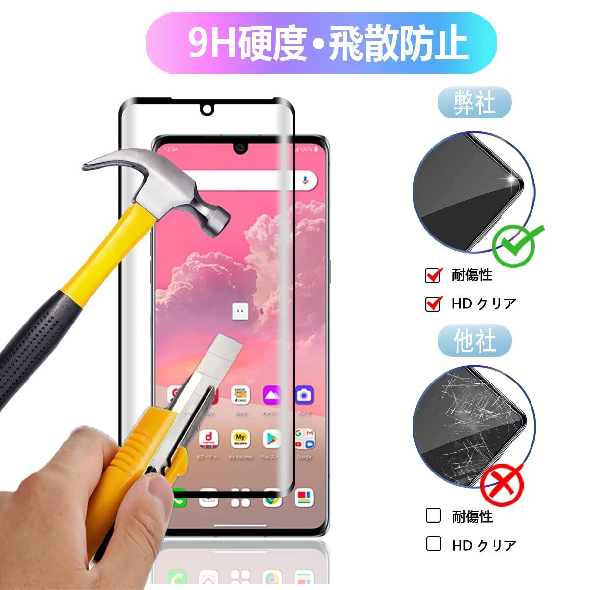 【9H硬度 飛散防止】 LG VELVET L-52A 対応 ガラスフィルム はす旭硝子で作られており、スマホ保護フィルムの中で最高レベルの9H硬度に達しています。手にフィットして持ちやすく滑りにくいので落ちにくいです。万が一落ちてもフィルムが衝撃を吸収してくれるので、スクリーンの損傷を最低限まで抑えられます。また、特殊な飛散防止設計により、ガラスが割れても飛散しないため、安心してお使いいただけます。