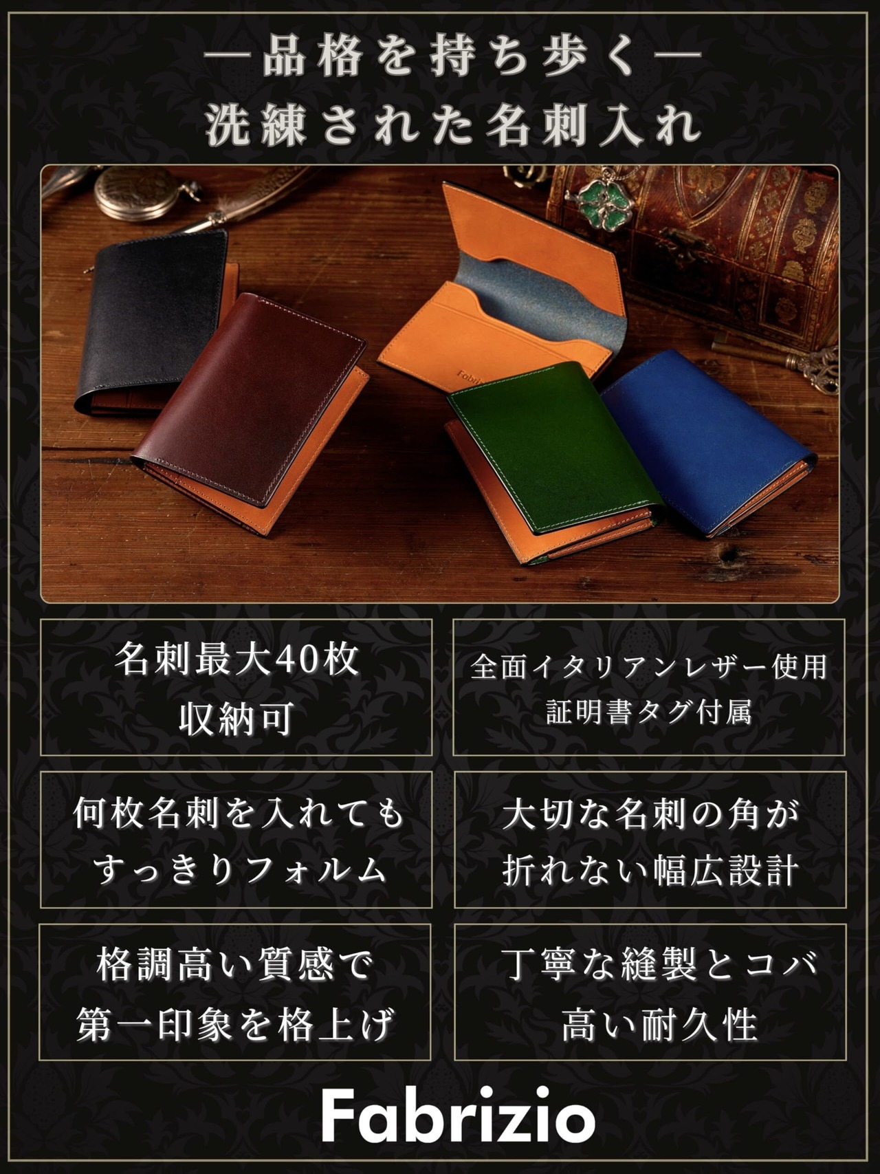 【ギフト ファブリツィオ 名刺入れ メンズ レディース 革 】上品な質感で 男性 女性 の様々なビジネスでの好印象を演出します。人気 の ブランド にも負けない高級感のある おしゃれ な めいしいれ です。創業50年老舗の イタリア コンチェリア・ガビアーノ社の 革 を使用。イタリア古来の 本革 の質感 経年変化による味わい深さ。イタリアのトスカナ地方で作られた革であることを保証する、イタリアタンニン植物鞣し革協会のタグを同梱。