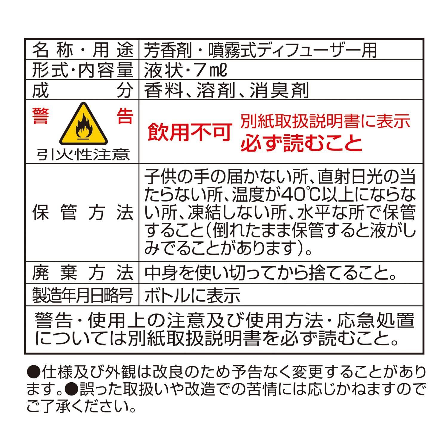 【内容量】7ml(1日1時間レベル2で使用した場合約8.5か月持続 *噴霧式ディフューザー2の場合)