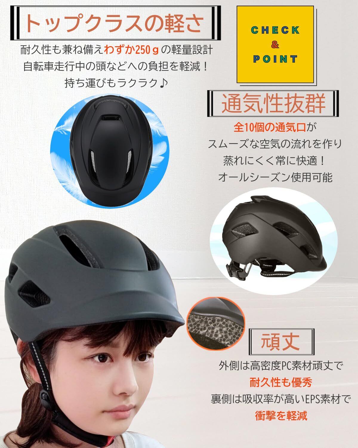 【軽量化実現】トップクラス軽量感!250gの軽量設計で、自転車走行 中頭や首への負担を減らし、快適にご使用いただけます。