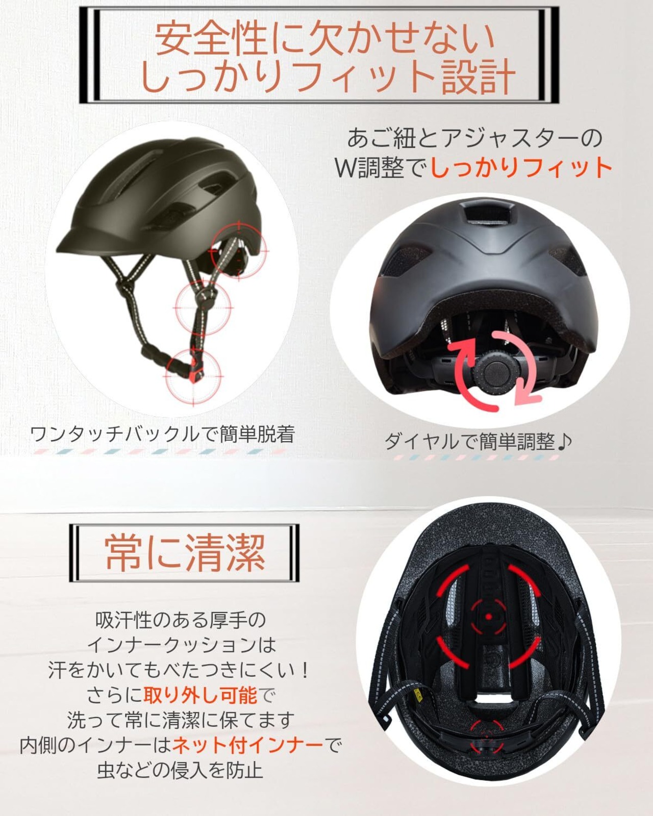 【しっかりフィット】頭囲57-61cmまで対応しており、後部にあるアジャスターのダイヤルを回すことで簡単に調整できます。あご紐も調整可能で頭部アジャスターとしっかり固定することで安全性UP!