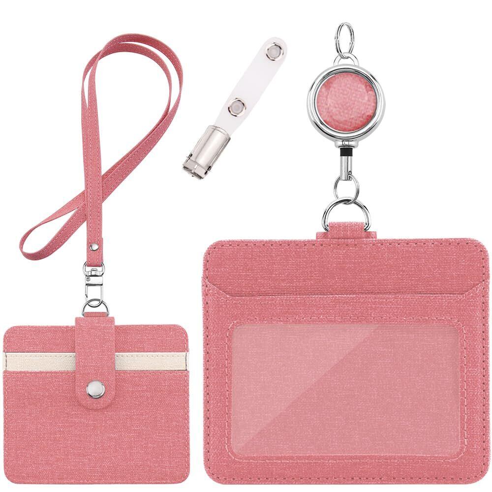 IDカードホルダー - 横型&縦型 IDカードケース ネームホルダー 両面用 名札 パスケース 胸ポケットクリップ&伸縮リール式 クリップストラップ付き(横型ピンク)