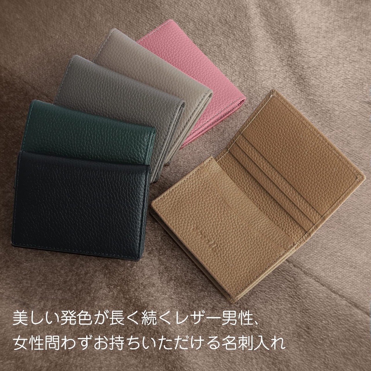 【バリエーション豊富な全6色】この名刺入れは綺麗な5カラー[ブラック/ブラウン/グレージュ/ピンク/ダークグリーン/トープ]が用意して、色の選ぶのが楽しくて、本革の質感が引き立つ美しい色味で、あなたにピッタリの色が見つかります。ビジネスファッションに合う渋い色あいで、革の持つ豊かな表情と質感を存分に楽しむ事が出来ます。男女兼用、ユニセックスで使えるから、男女お揃いにしてのご仕様も素敵です。自分使用は勿論、贈り物としても喜ばれるでしょう。