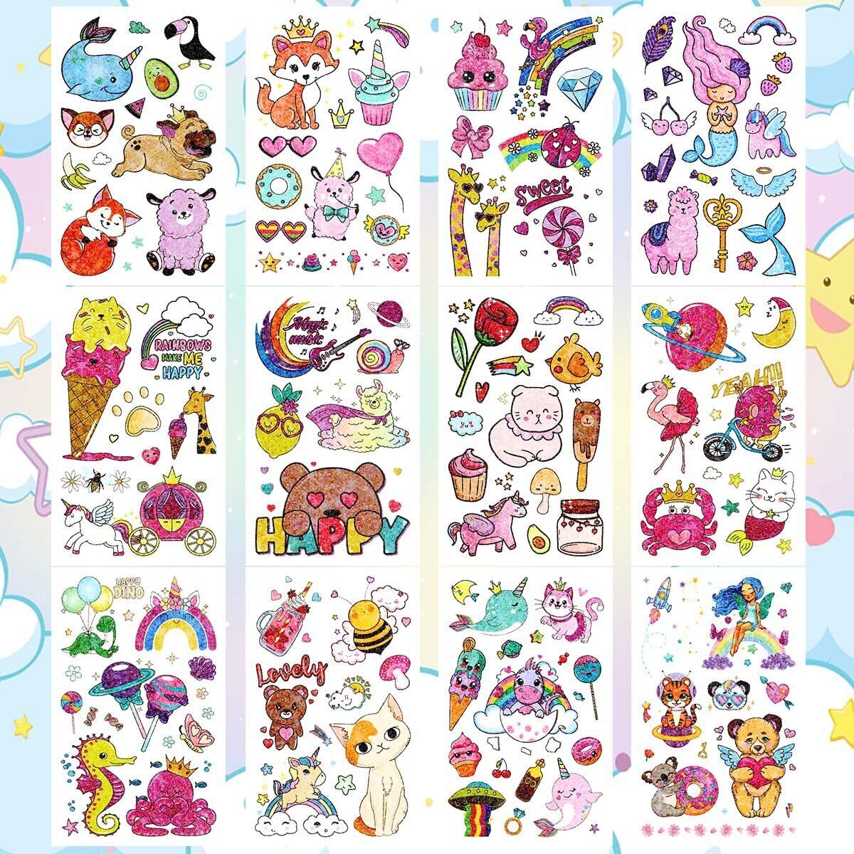 ✡️子供タトゥーシール キラキラ: 12枚キラキラと活気のある子供の漫画のタトゥーシール、7.5*12CM/枚、ユニコーン、キツネ、キリン、人魚姫、風船、虹、マジックワンド、ダイヤモンド、ロリポップ、ドーナツ、アルパカ、クマ、アイスクリーム、ドーナツ、猫、ひよこ、バラ、蝶、蜂、タコ、タツノオトシゴ、コアラ、カニ、フラミンゴなど。一時的なボディ・デコレーションセットです。小さいで魅力的なデザインになりました。