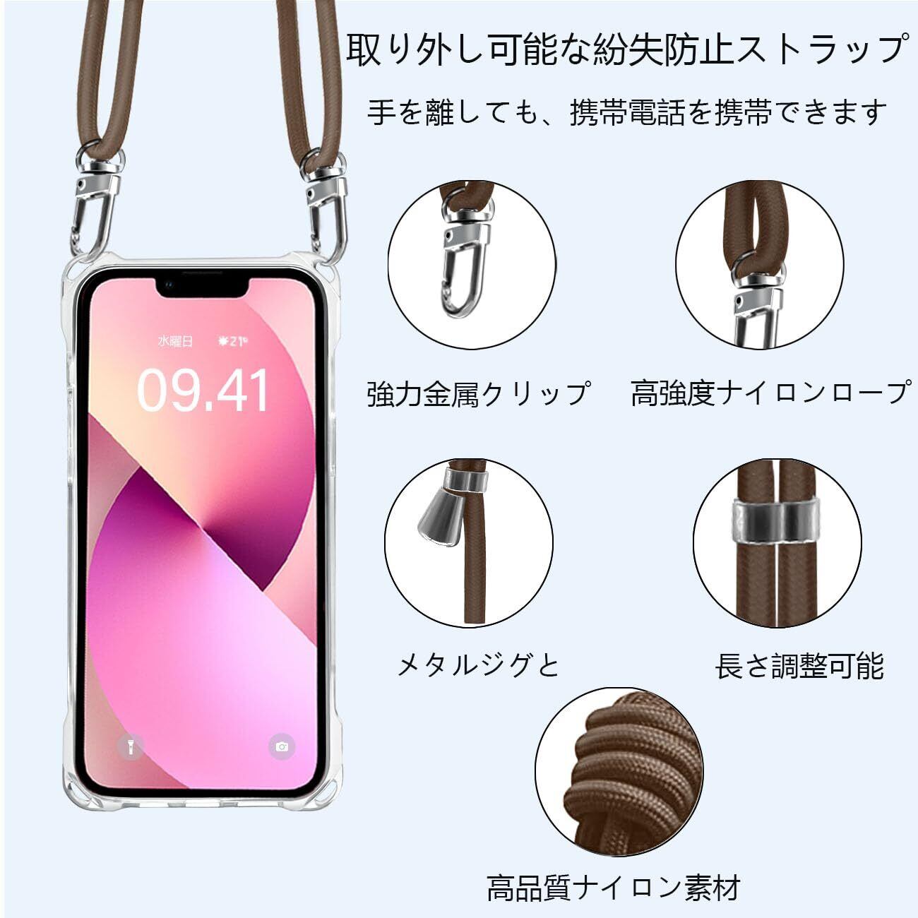 Peipeizi iPhone 14 ケース ショルダー クリア 肩掛け 首掛け アイフォン14 スマホケース ワイヤレス充電対応 カバー 耐衝撃 透明 軽量 全面保護 人気 韓国 柔軟 高質感(ブラウン)