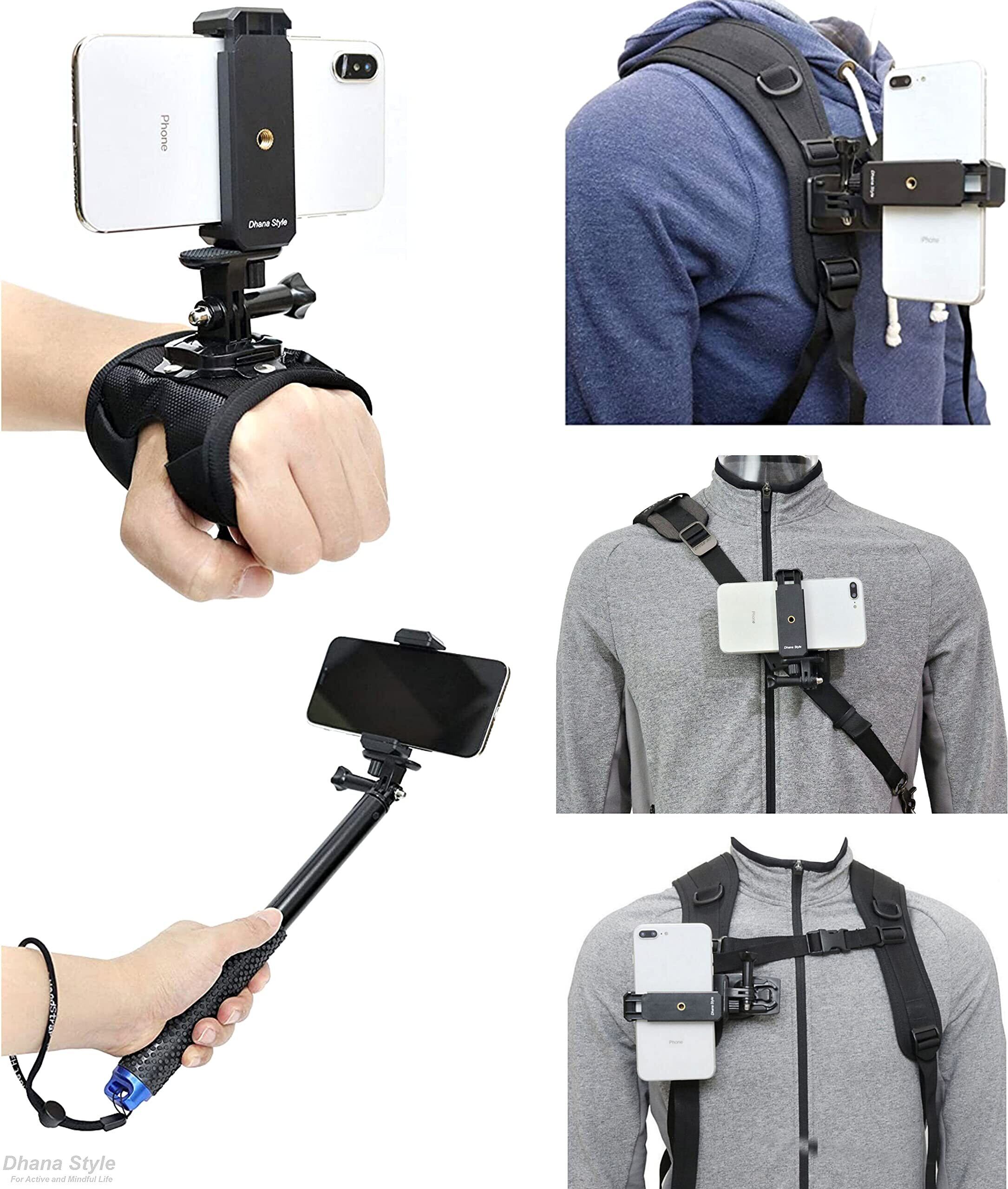 GoPro用マウント ウェアラブルカメラ(スポーツ・アクションカメラ)アクセサリー、撮影機材、アダプタなどにiPhone, Android 機種等のスマートフォンをセットして使用が出来る専用マウント変換アタッチメント・アダプターとスマホホルダーのセット商品です。 ※マウント変換アダプター単体で1/4インチネジ穴を搭載した互換性のある小型のデジタルカメラやウェアラブルカメラ・ビデオカメラにも対応します。