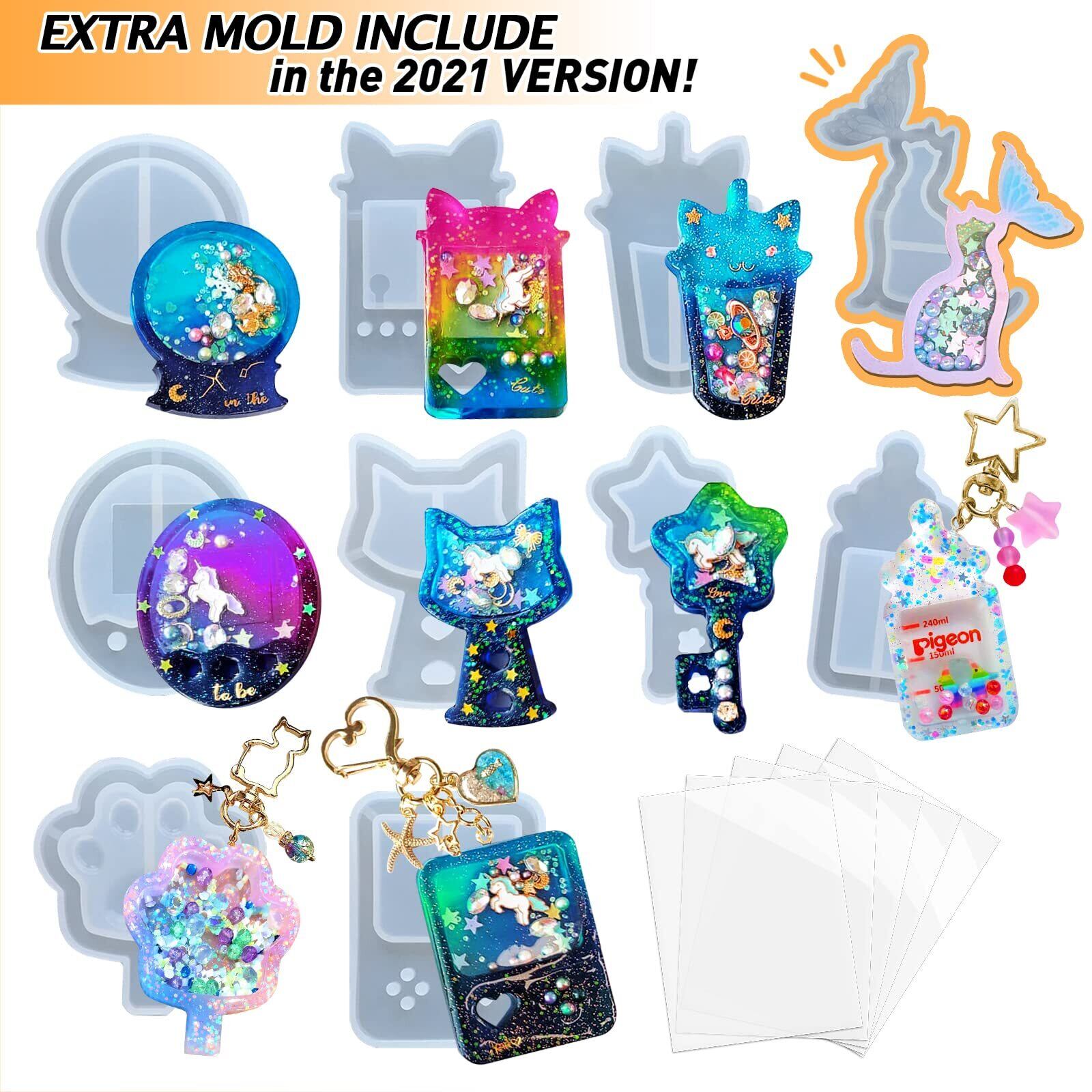 エポキシ樹脂成型金型と透明シールフィルムの15枚セットです。 リキッドシェイカーレジンチャーム、ペンダント、ジュエリー製作用品。さまざまな形のモールドが含まれています_哺乳瓶、ゲーム機(たまご、四角)、猫耳、キティガシャポンマシン、クローマシン、丸い水晶玉、ドリンクカップ、星の魔法の杖、肉球、蝶の付いた猫。注意:セット内容はシェイカーモールド10個+ppシート5枚のみが含まれています。