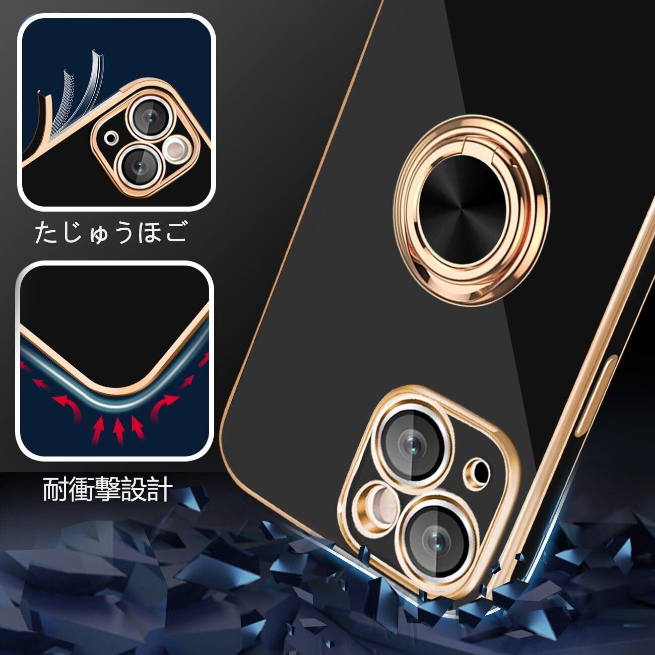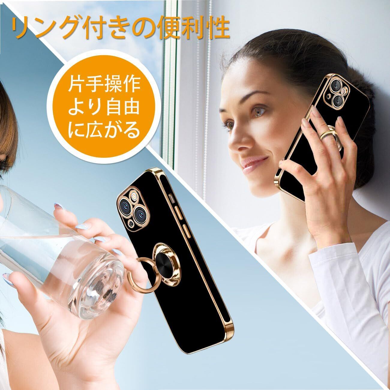 KEHUALLE iPhone 13 ケース リング付き スマホケース いphone 13 ケース 耐衝撃 メッキ加工 TPU カバー 車載ホルダー対応 360度回転 多機能 スタンド機能 ストラップホール付き アイフォン 13 ケース 6.1 インチ用 (ブラック)