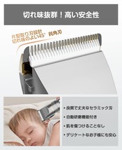 【安全安心なベビーモード&低騒音】電源スイッチを三秒以上長押すと安全ロック標識が五回点滅してベビーモードに入り、スイッチを間違って押しても起動しない仕組みです。バッグに入れる時も、子供がある場所にも安心できます。最新の振動を軽減する低騒音技術を採用し、部屋で普通の話し音との程度なので、騒音を気にせず近所に迷惑をかけません。子供やお子様が驚くことはなく、赤ちゃんが寝ている間に髪を切っても起こす心配もありません。幼児からお年寄りまで誰でも安心で簡単にカット!
