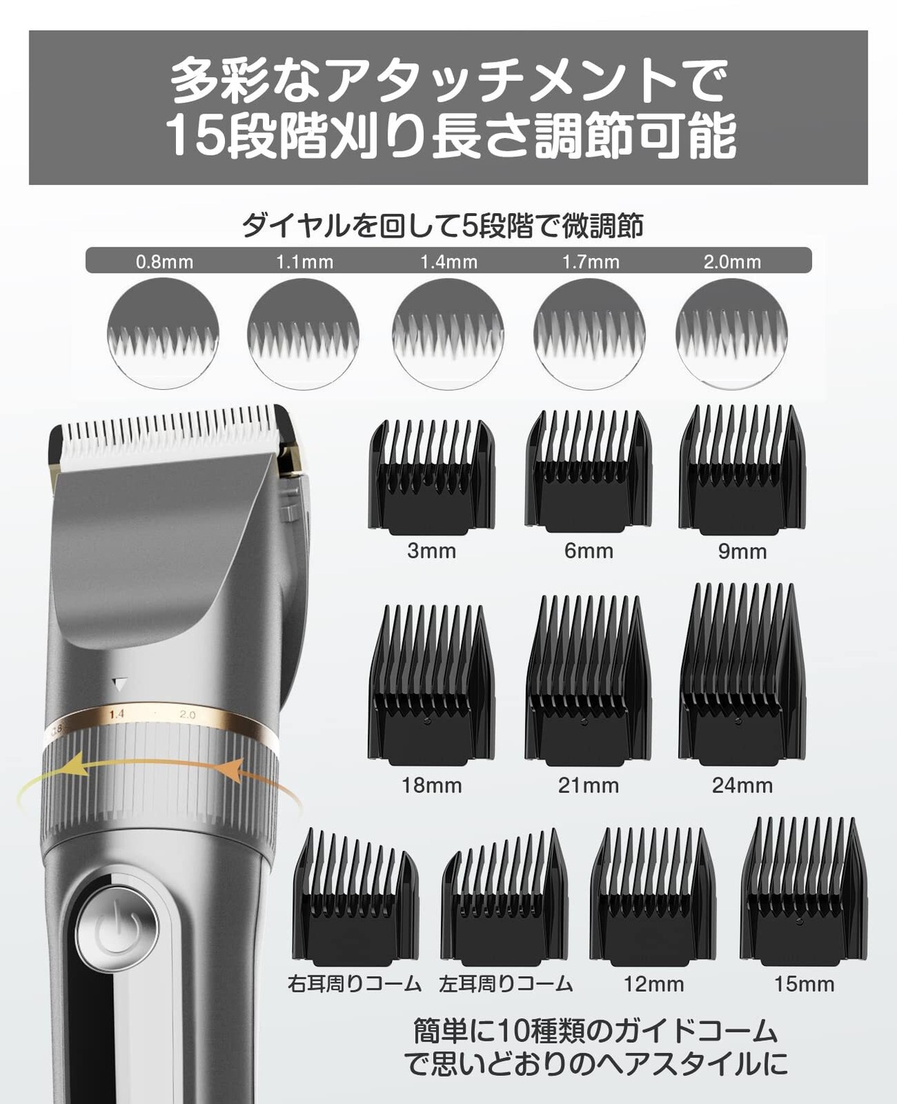 【5段階刈り高さ&10種類ガイドコーム】ダイヤルと合わせて0.8mm-2.0mmまで0.3mmずつ5段階の刈り高さを自由に調節できる電動バリカンです。それに、3mm、6mm、9mm、12mm、15mm、18mm、21mm、24mm、左&右もみあげ櫛のような10種類ガイドコームを付属して必要に応じて選べて、お好みにより髪の長さに簡単キレイにカットできます。髪の毛を少し整え、坊主まで、床屋に行かず自宅で簡単に多彩なアタッチメントで思いどおりのヘアスタイルも色々と楽しめます。