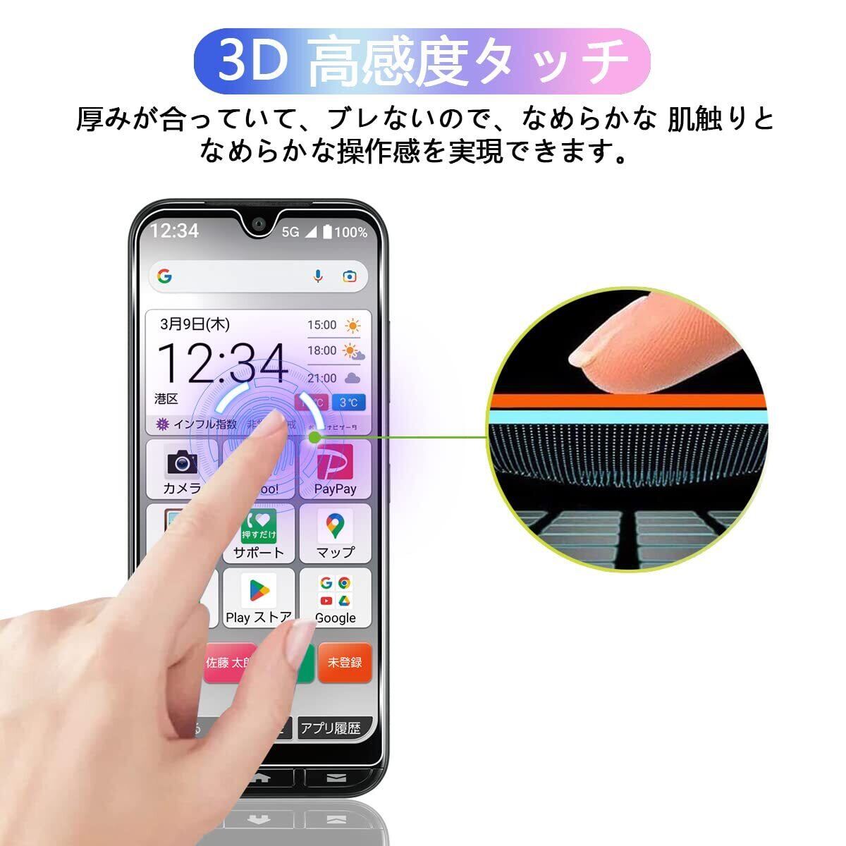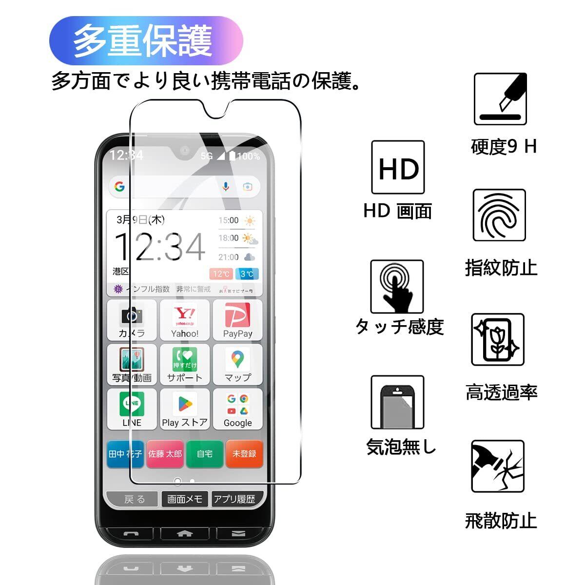 【対応機種 】 対応 かんたんスマホ 3 A205KC ガラスフィルム,専用液晶画面保護ガラスフィルム。フィルムのシリコン自己吸着層により、スチールフィルムを携帯電話に合わせて軽く置くだけで、気泡が入らないように簡単に取り付けられます。