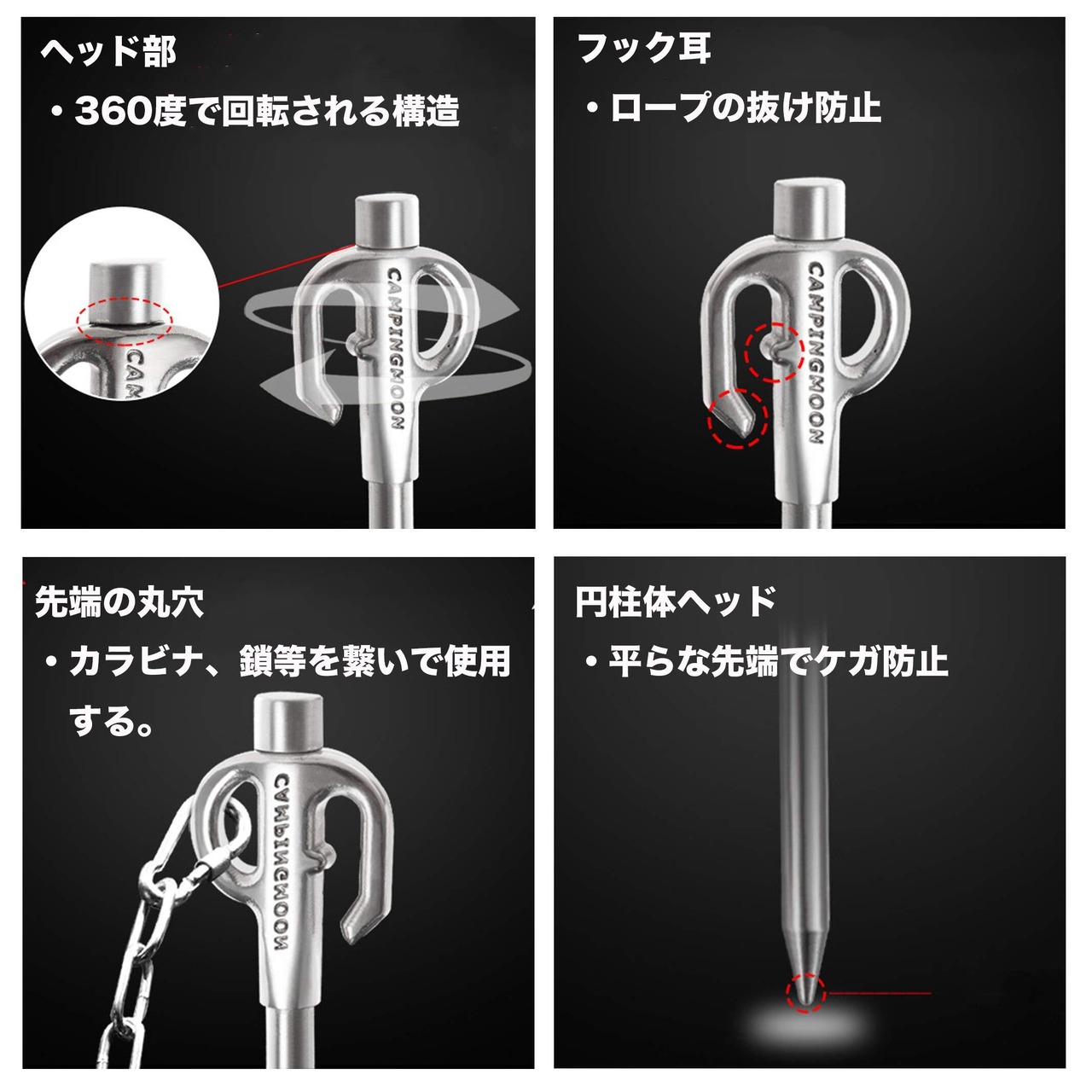 特徴:固い地面にも打ち込め、ヘッド部が360度回転できる