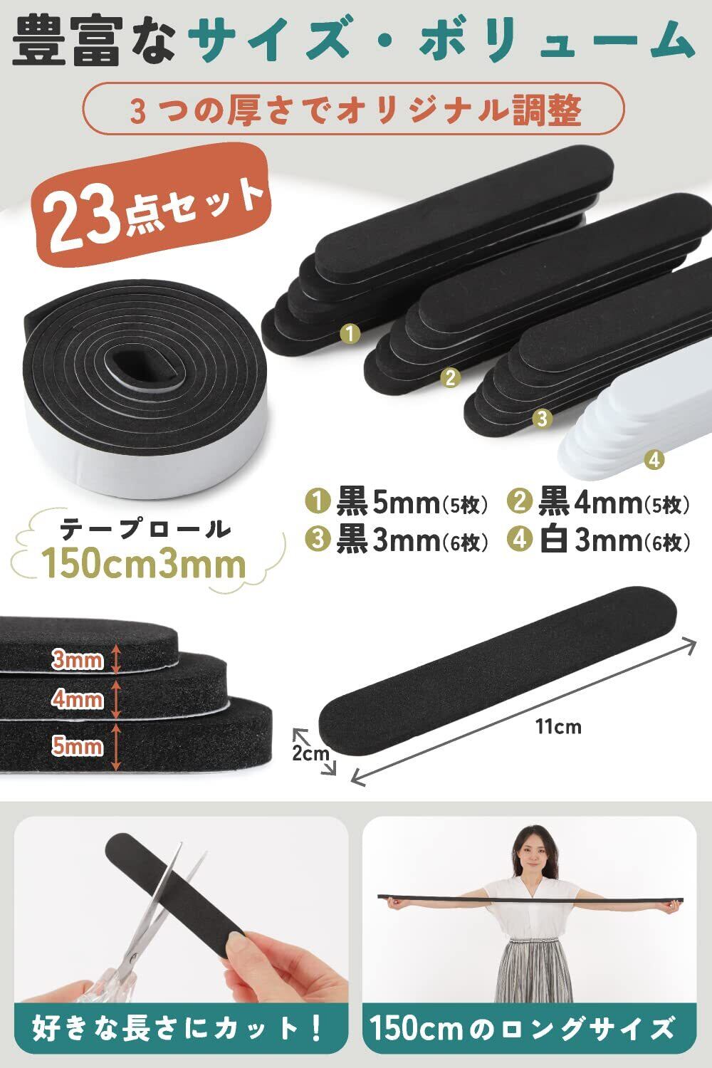 【 豊富なサイズ・ボリューム 】複数の帽子、家族でも使えるたっぷりボリューム。メンズ レディース ベビー 子供【内容物】各6枚 幅20mm:厚さ 3mm白色、3mm黒色。各5枚:4mm 黒色、5mm黒色。1点:テープロール 長さ150cm 厚さ3mm。テープをハサミでカットし好きな長さにできます。