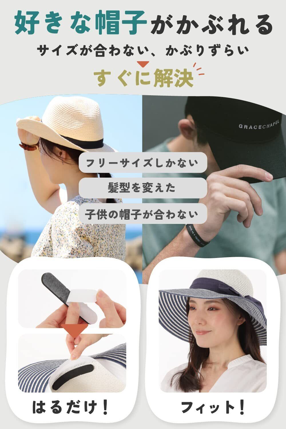 【 好きな帽子がかぶれる 】お気に入りの帽子がフリーサイズしかない。髪型を変えたらブカブカになったなど、サイズが大きくて合わないお悩みのある方に最適な帽子サイズテープです。厚めの帽子サイズ調節テープで、あなたのオリジナルサイズに調節してください