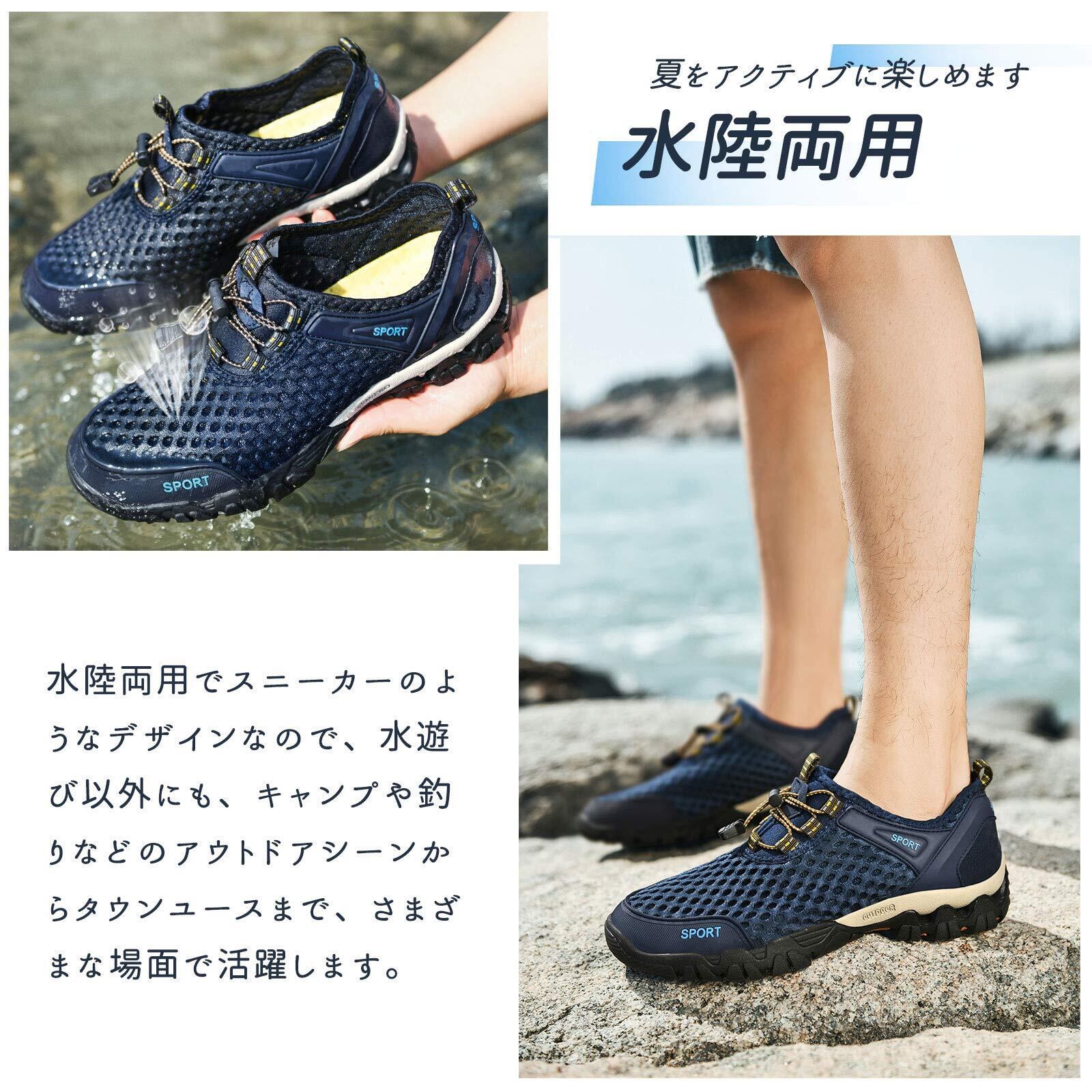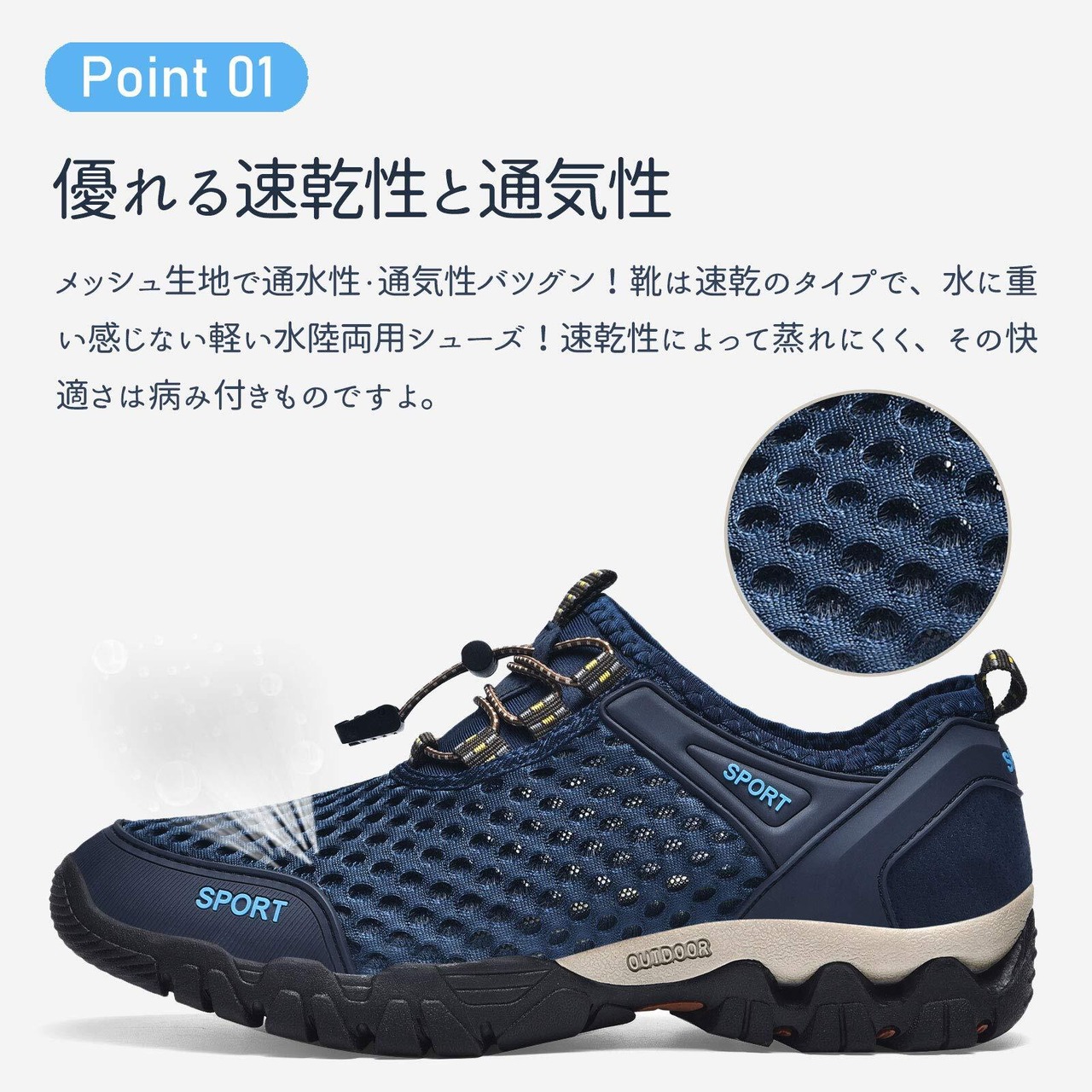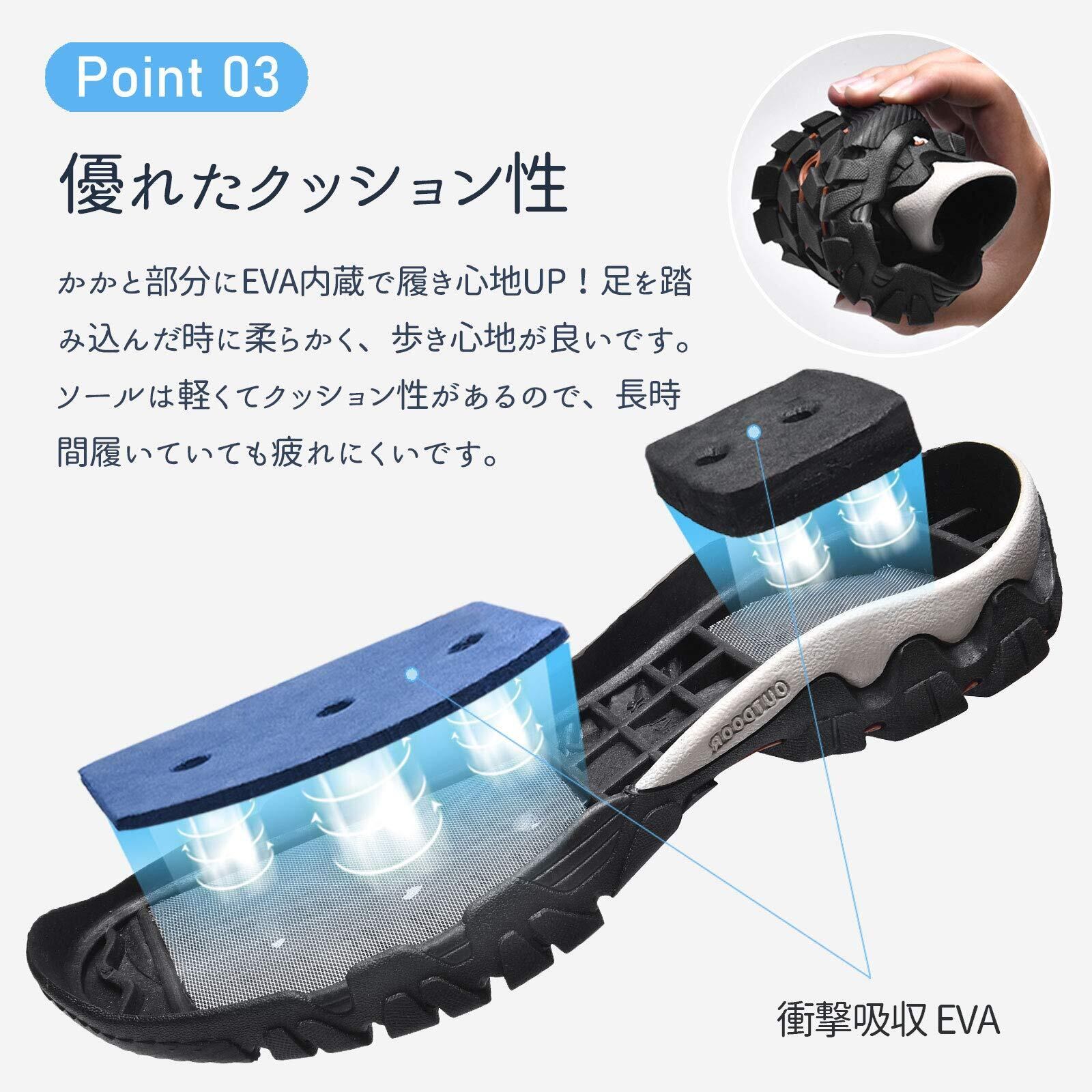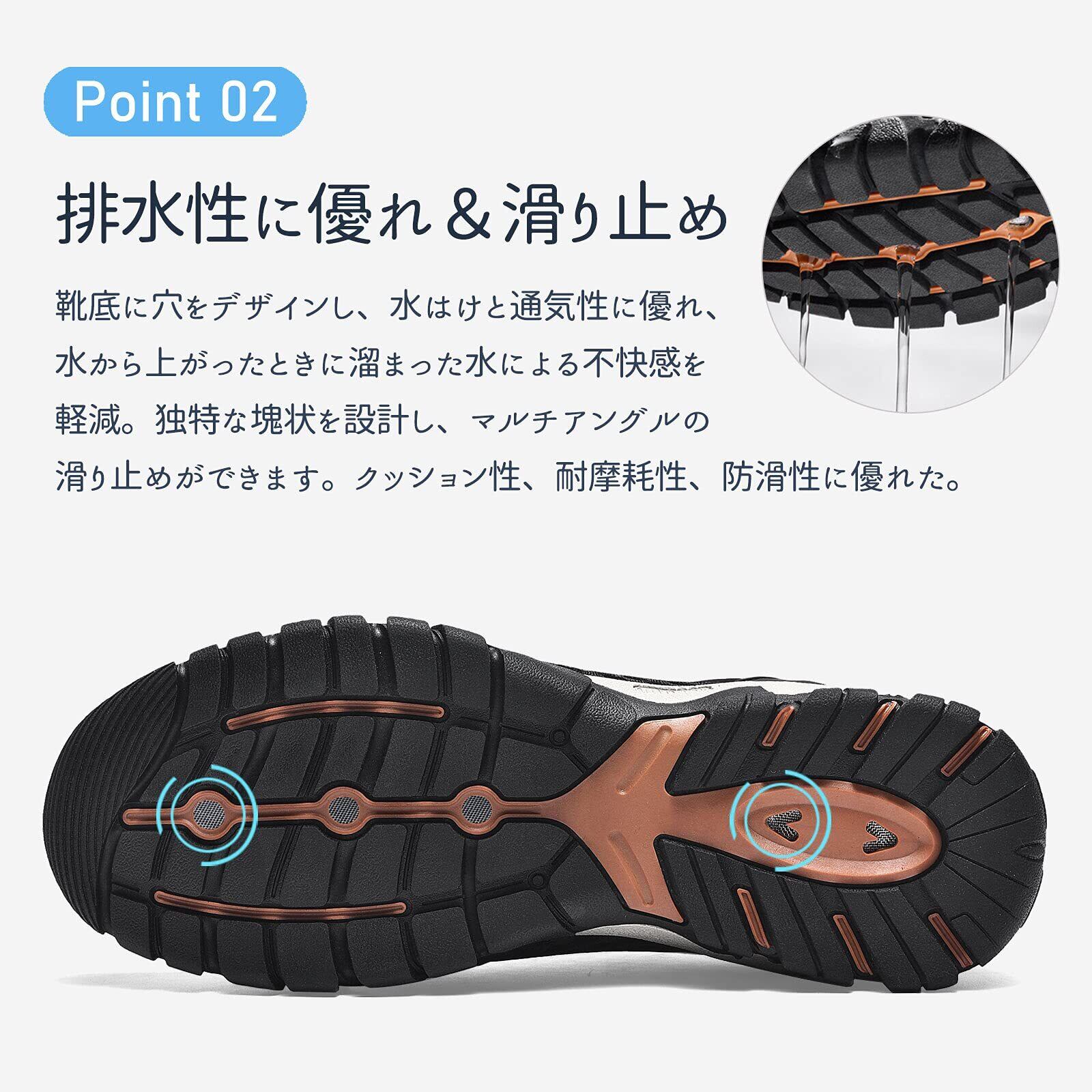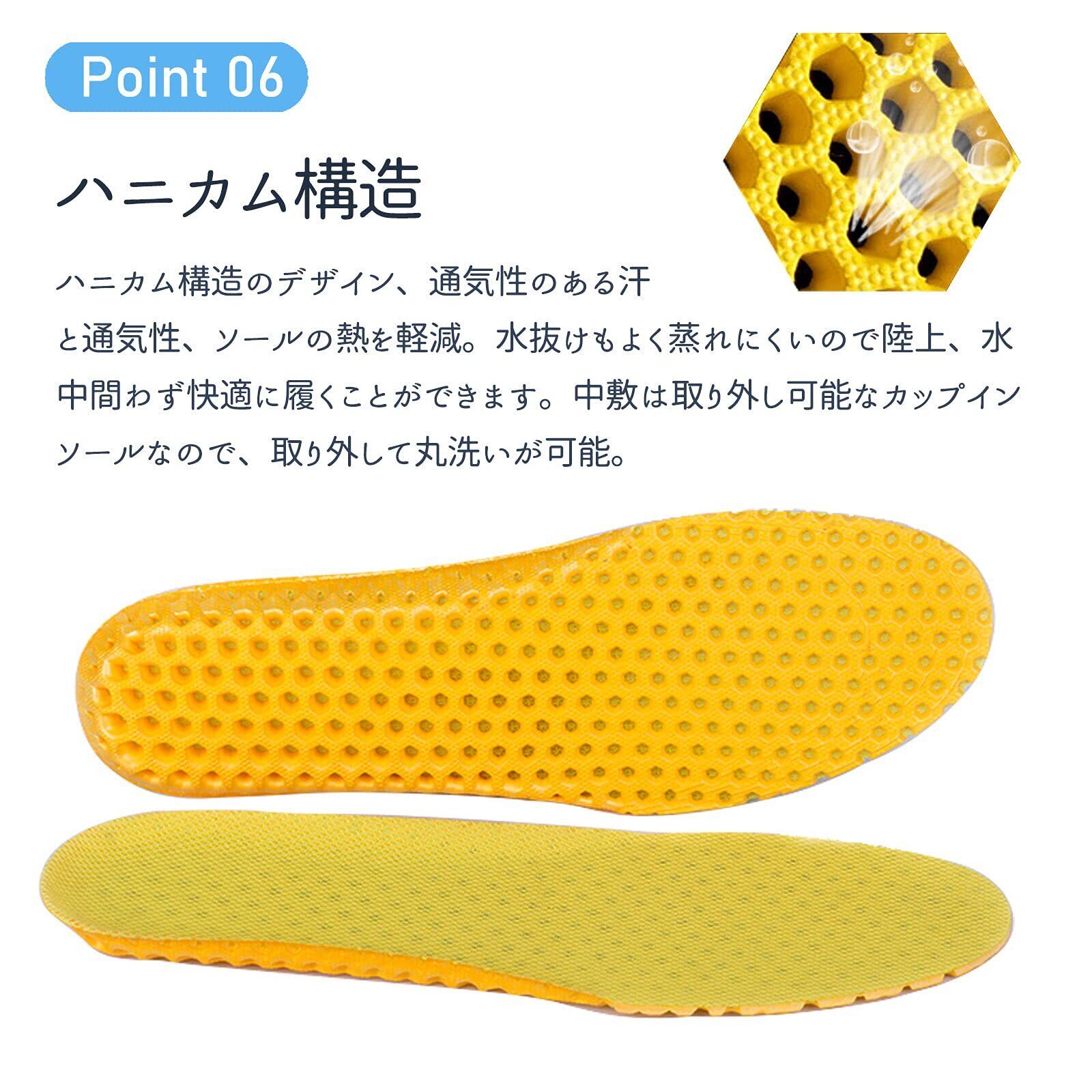 【優れる速乾性と排水性】靴底は穴を付いているため、水が通じやすいデザイン!インソールにも穴が付き、通気性や排水性さらにアップします。靴は速乾性の特徴が持つので、決して重く感じません。