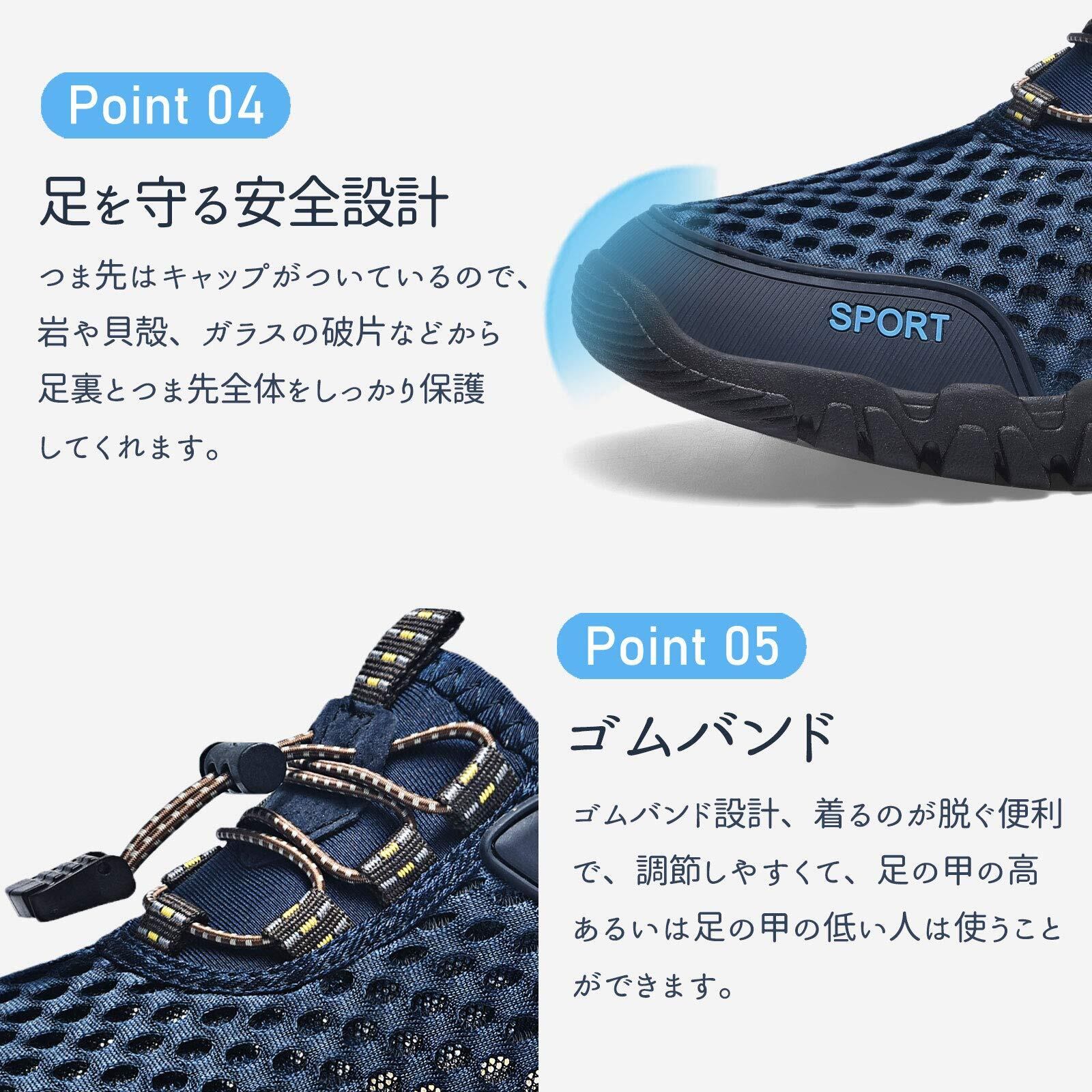 【安全性がいい】様々なバターンの凸凹を組み合わせた靴底は滑り止め機能があります。濡れ地面や磯や川などには滑り止めします。また、ソールがつま先とかかとの両方を包み込む設計になっているので、水辺でのケガ防止にも心強い1足。