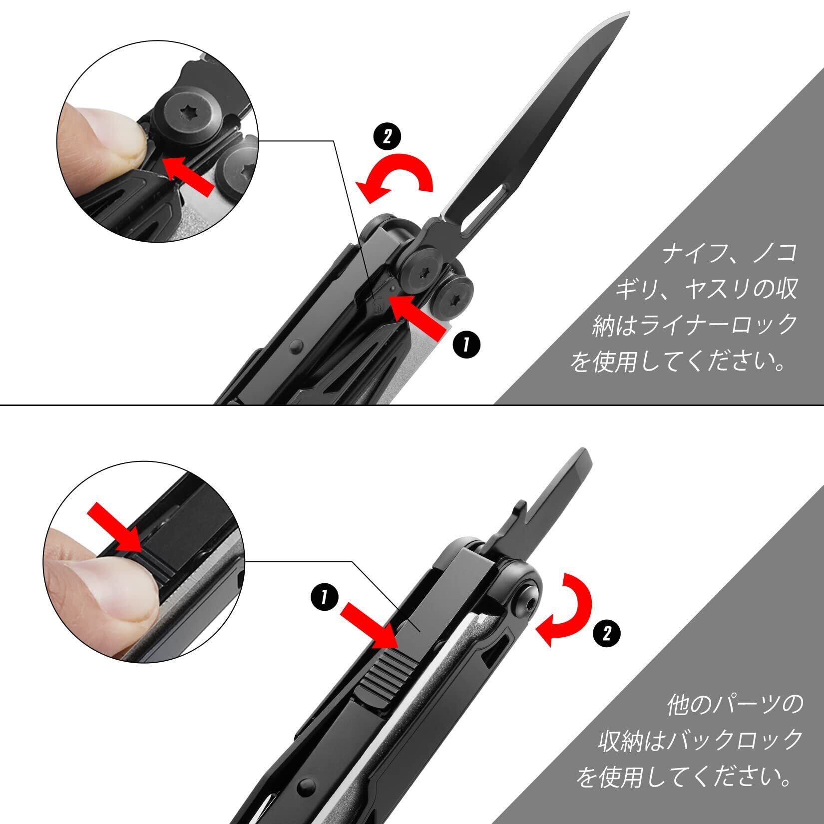 【バックロック&ライナーロック機能】ナイフ・ノコギリはライナーロックで、展開する際カチッというロックの音が聞こえ、使用中安心感を与えます。他のパーツの収納はバックロックで、解除も簡単、バックロックボタンを押すだけで折り畳めます。