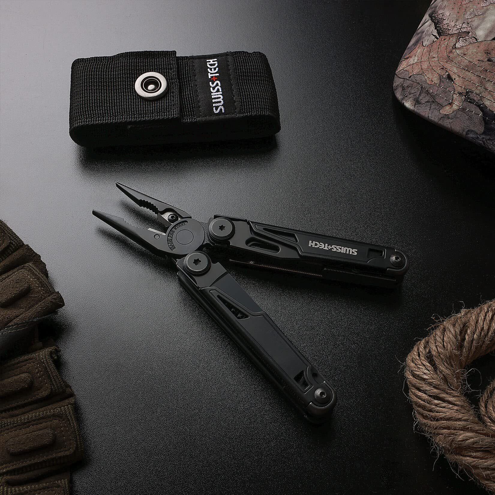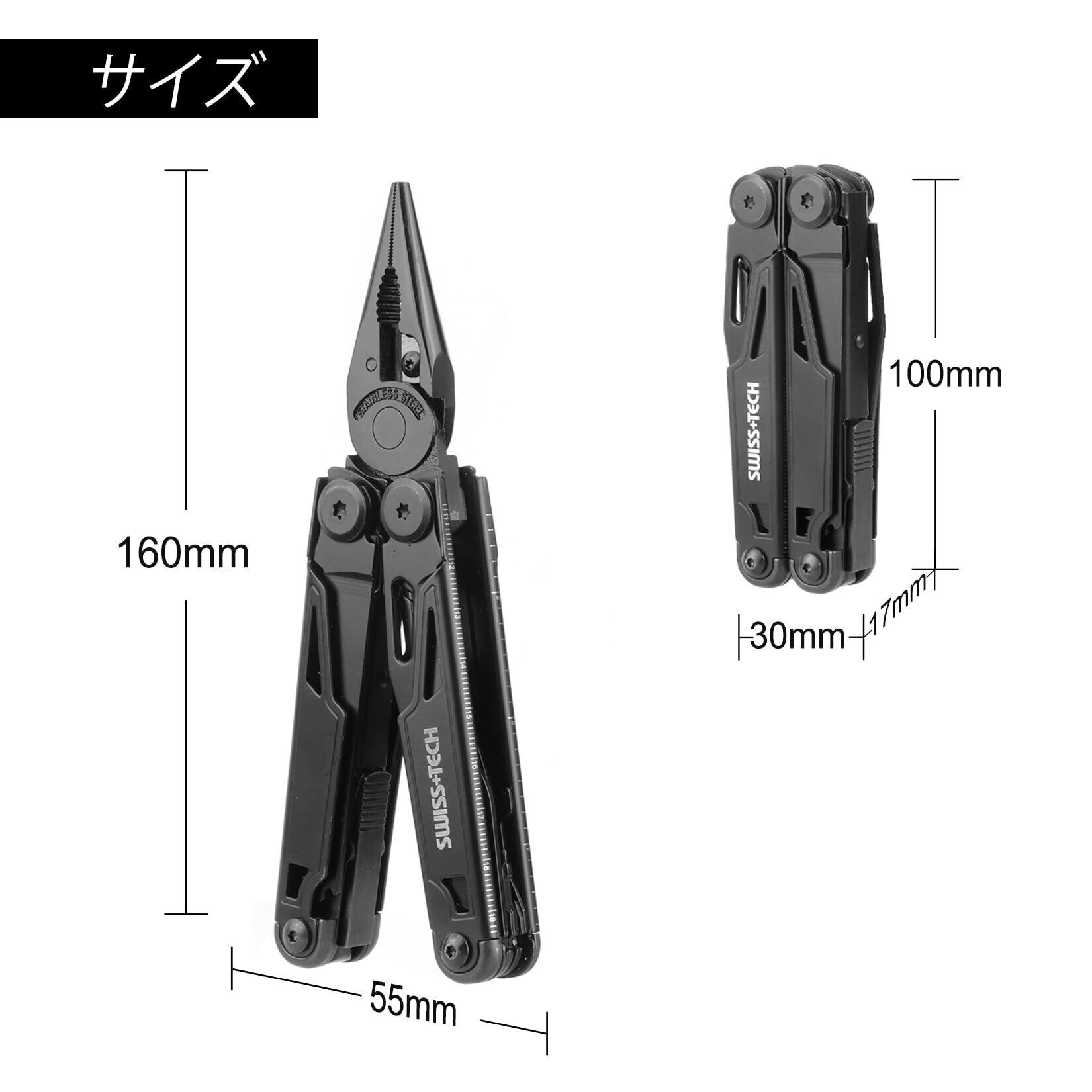 SWISS+TECH 多機能ペンチ アウトドアマルチツール マルチプライヤー 16-in-1 ロック機能搭載 カッター ノコギリ ドライバー メジャー 栓抜き ヤスリ ポーチ付 アウトドア DIY 登山 キャンプ 釣り 防災用品 黒染め
