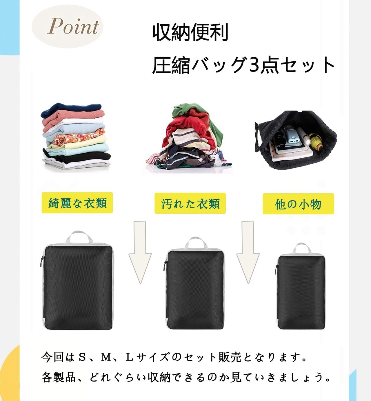 【保証】パッケージにあるもの:圧縮バッグL約 40*30cm、M約 35*25cm、S約 30*20cm。何か問題がございましたら、お気軽にメールよりご連絡ください、弊社の営業担当は至急に対応いたします。