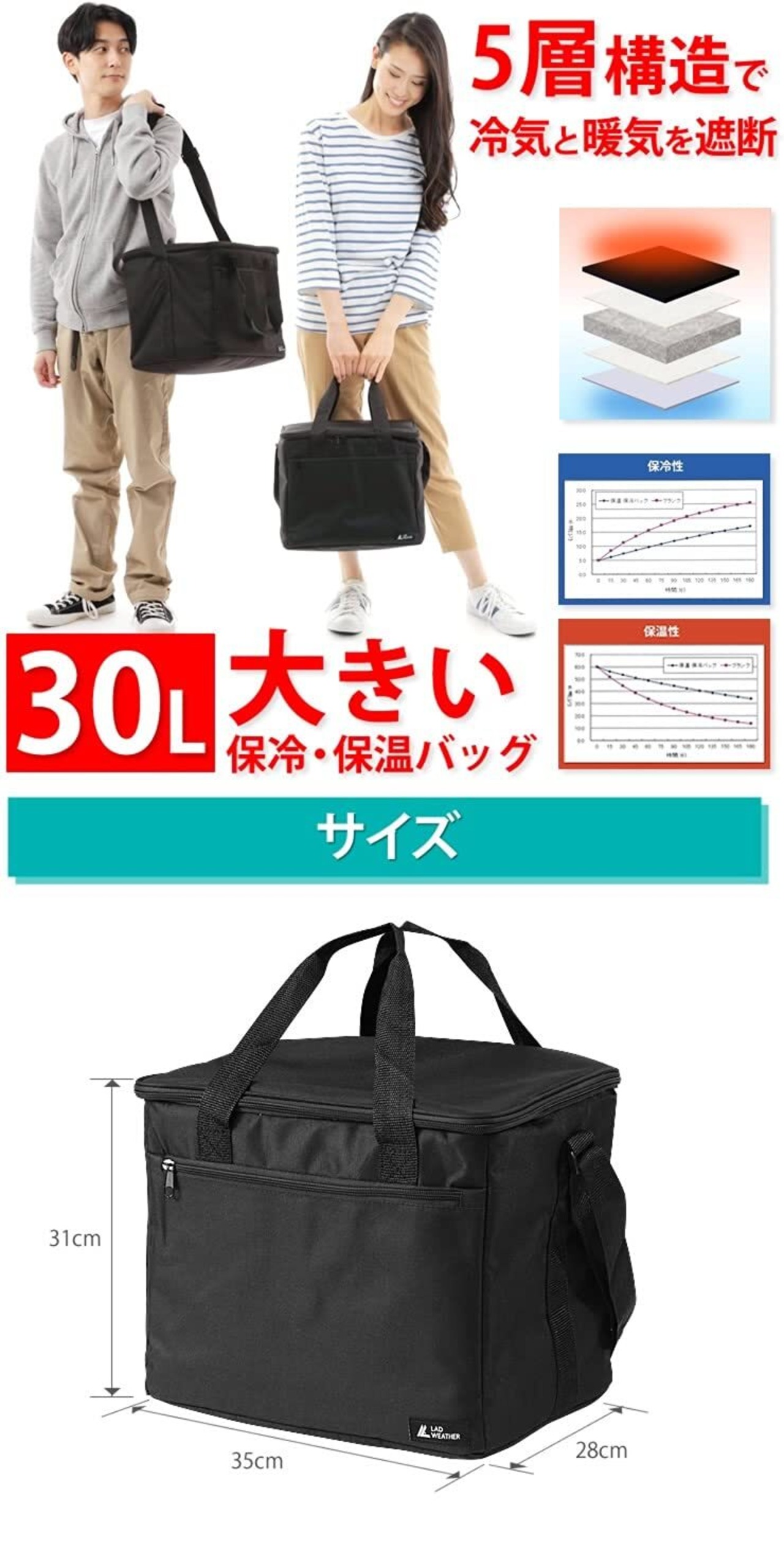 [ラドウェザー] 保冷バッグ 30L 大容量 5層構造 保温バッグ クーラーバッグ ソフトクーラーボックス キャンプ アウトドア バッグ 人気 (30リットル/ブラック)