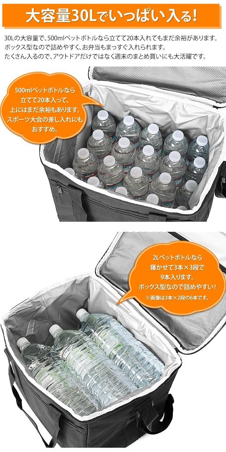 大容量30Lでいっぱい入る!:30Lの大容量で、500mlペットボトルなら立てて20本入れてもまだ余裕があります。 ボックス型なので詰めやすく、お弁当もまっすぐ入れられます。 たくさん入るので、アウトドアだけではなく週末のまとめ買いにも大活躍です。 500mlペットボトルなら立てて20本入って、上にはまだ余裕もあります。 スポーツ大会の差し入れにもおすすめ。 2Lペットボトルなら寝かせて3本×3段で9本入ります。 ボックス型なので詰めやすい!