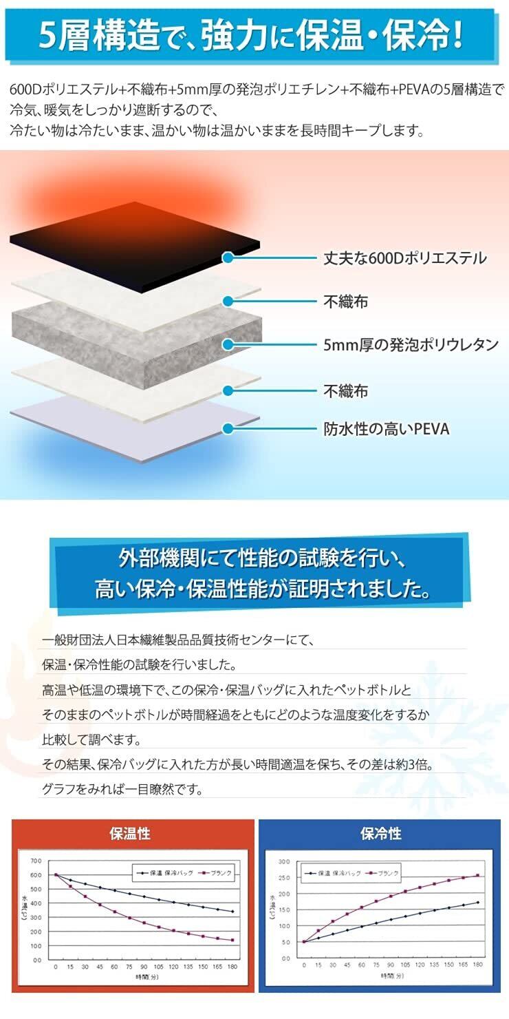 5層構造で、強力に保温・保冷:600Dポリエステル+不織布+5mm厚の発泡ポリエチレン+不織布+PEVAの5層構造で冷気、暖気をしっかり遮断するので、冷たい物は冷たいまま、温かい物は温かいままを長時間キープします。 外部機関にて性能の試験を行い、高い保冷・保温性能が証明されました。 一般財団法人日本繊維製品品質技術センターにて、保温・保冷性能の試験を行いました。 高温や低温の環境下で、この保冷・保温バッグに入れたペットボトルとそのままのペットボトルが時間経過をともにどのような温度変化をするか比較して調べます。 その結果、保冷バッグに入れた方が長い時間適温を保ち、その差は約3倍。 グラフをみれば一目瞭然です。