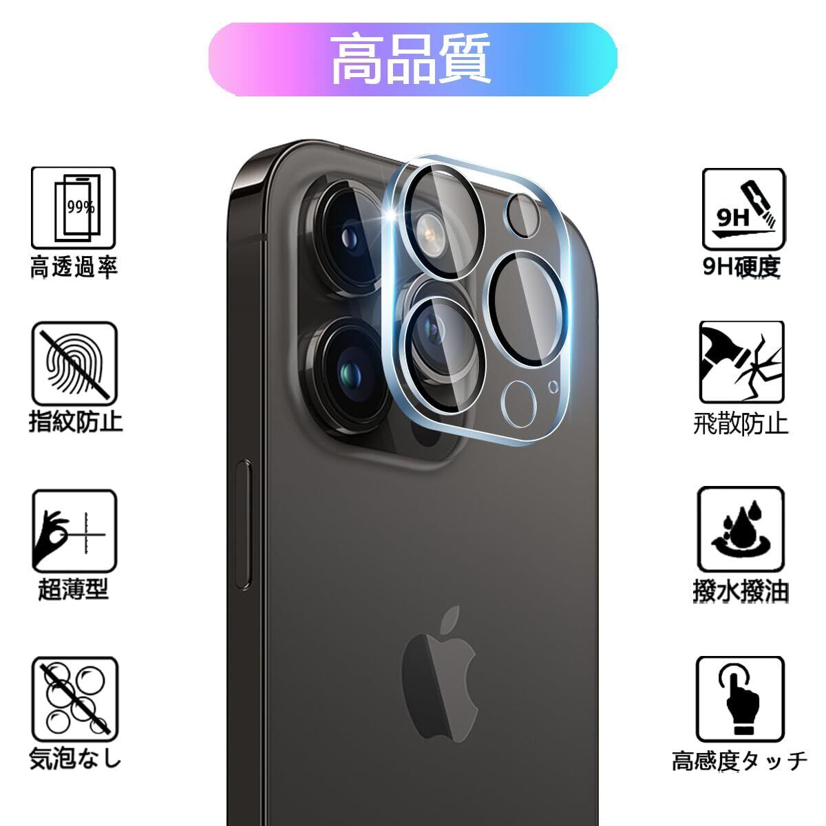 【9H硬度 飛散防止】 対応 アイフォン 14 Pro / アイフォン 14 Pro Max カメラフィルム はす旭硝子で作られており、スマホ保護フィルムの中で最高レベルの9H硬度に達しています。手にフィットして持ちやすく滑りにくいので落ちにくいです。万が一落ちてもフィルムが衝撃を吸収してくれるので、レンズの損傷を最低限まで抑えられます。また、特殊な飛散防止設計により、ガラスが割れても飛散しないため、安心してお使いいただけます。