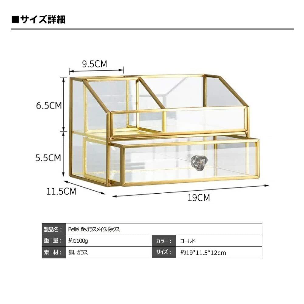【製品仕様寸法】:19*11.5*12cm;商品特徴:収納便利、可愛い外観;色:ゴールド;材質:ガラス;適用場所:バスルーム、寝室、化粧台など。 ご注意:手作業のため、黄銅制品の連結部は軽い不整があります。コスメは含まれていない。