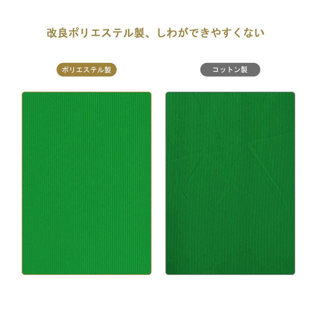 【改良版・100%ポリエステル製】グリーンバックは改良後の少々硬いポリエステル材質を採用して、綿製と改良前のポリエステル材質よりシワが目立たなく、低温アイロンでシワを易く取れます。シワになりにくく、頑丈で、乾きやすい、「ポリエステル100%」を採用しました。また緑布は定番のポリエステル無地、ほどよい厚みで扱いやすいです。