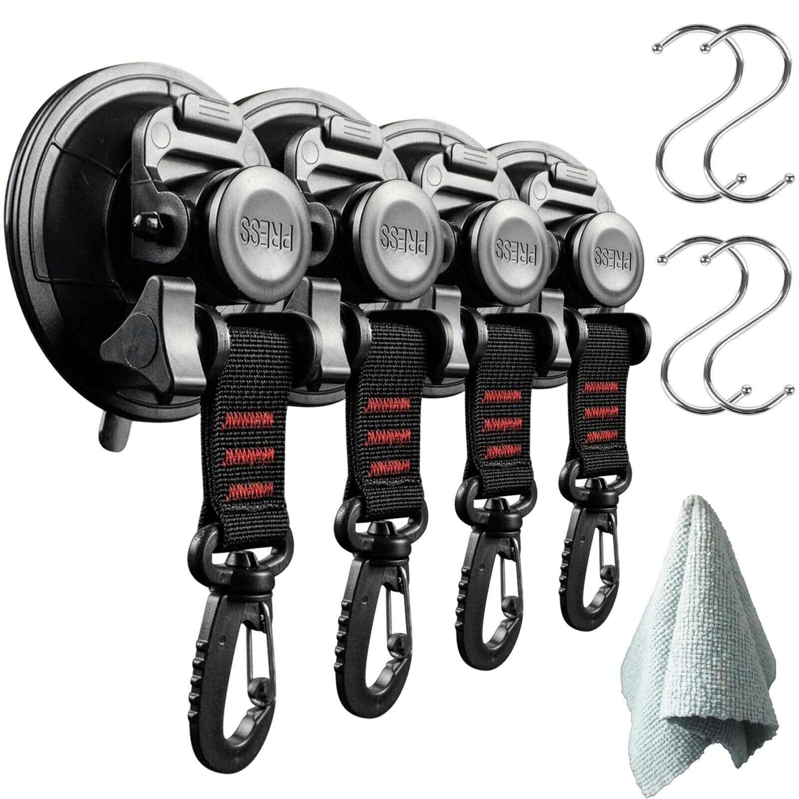 【強力真空吸盤フックセット】セット内容:吸盤フック4個、S字フック4個、タオル1枚。360度回転しロック式の自由度の高いフックです。使用前に付属のタオルでガラスを拭くことができます。車のサイドテントやサンシェードの固定に使う場合は取付穴の種類によってS字フックを選択することができます。吸盤素材:PVC+ABS・サイズ:直径9cm*厚さ4cm・耐荷重:静止状態で30kg