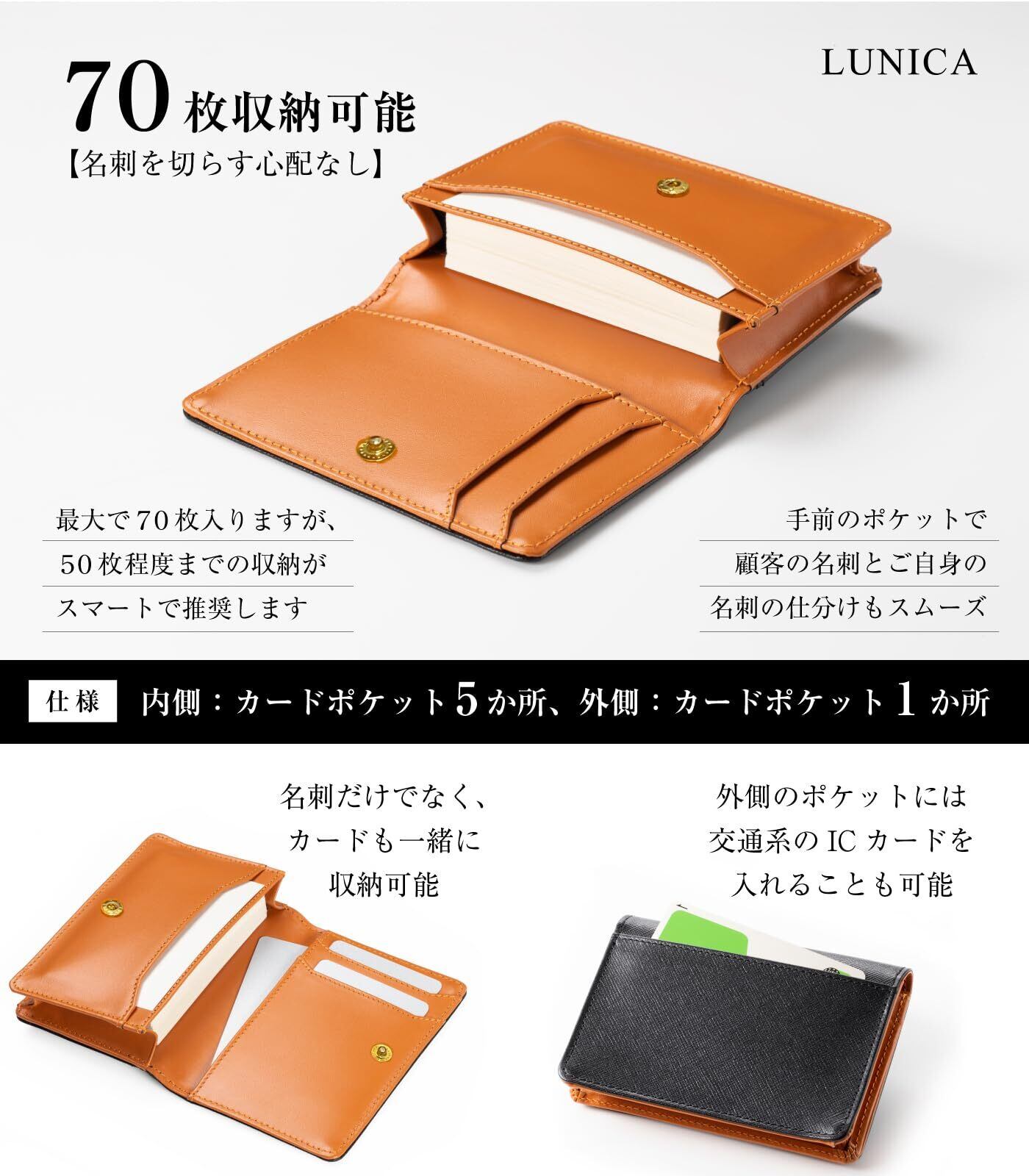 【大容量/70枚収納可能】◆仕様/内側:カードポケット5か所、外側:カードポケット1か所 メインポケットには70枚の名刺を収納でき、名刺を切らす心配がありません。ボタン留が付いているため、商談中に開いてくる心配もありません。手前のポケットで顧客の名刺とご自身の名刺の仕分けもスムーズです。また、ポケットがたくさんあるので、名刺だけでなく、カードも一緒に収納可能。外側のポケットには交通系のICカードを入れることもでき、定期入れとしてもご使用いただけます。