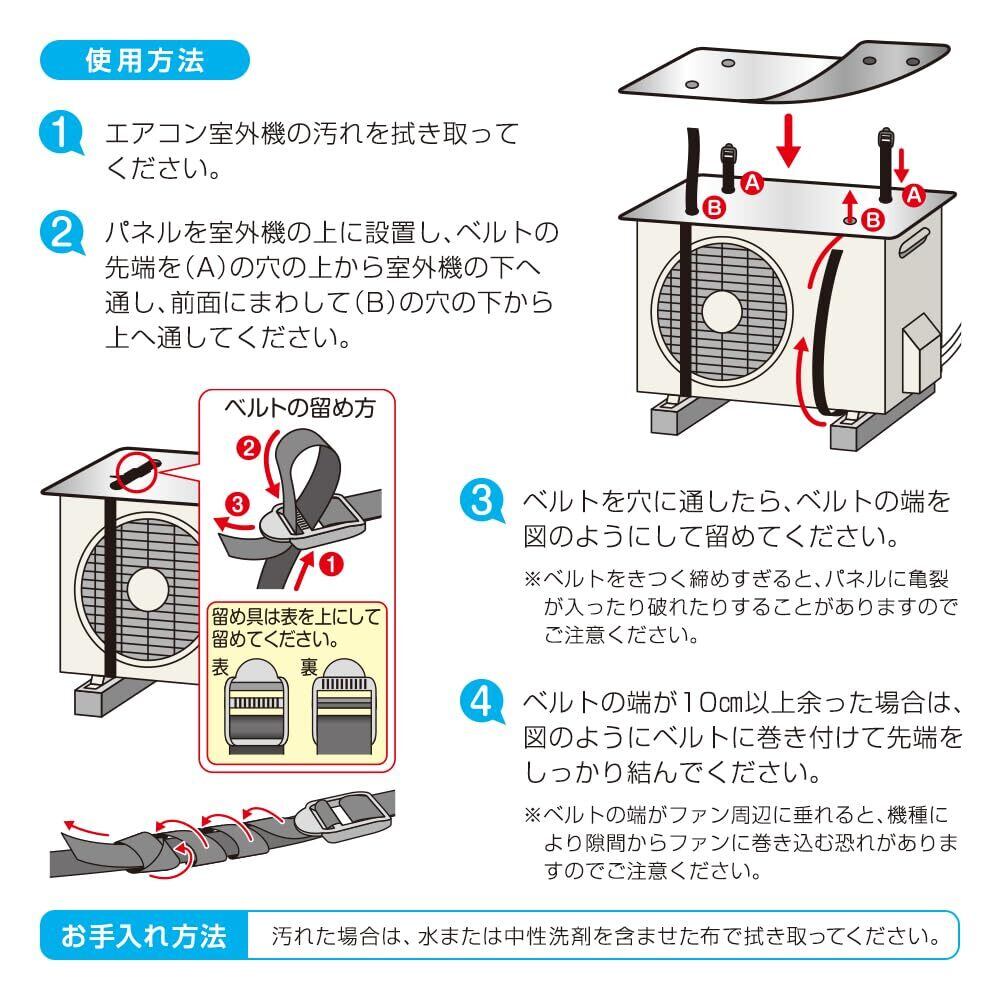 【工具不要】ベルトで固定するだけなので、取付方法は簡単です! 室外機1台につき専用ベルト2本で固定。
