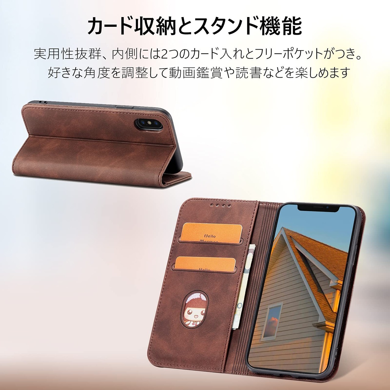 【カード収納とスタンド機能】iphonexs 手帳形ケース動画視聴に便利なスタンド機能が付き、横向いて斜めに立てて、お好きな角度を調整でき、両手が解放され、お気軽に読書やビデオの観賞を楽しむことができます。内側には2つのカード入れとフリーポケットがつき、名刺や定期券の収納に優れているiphonex ケース 手帳です。