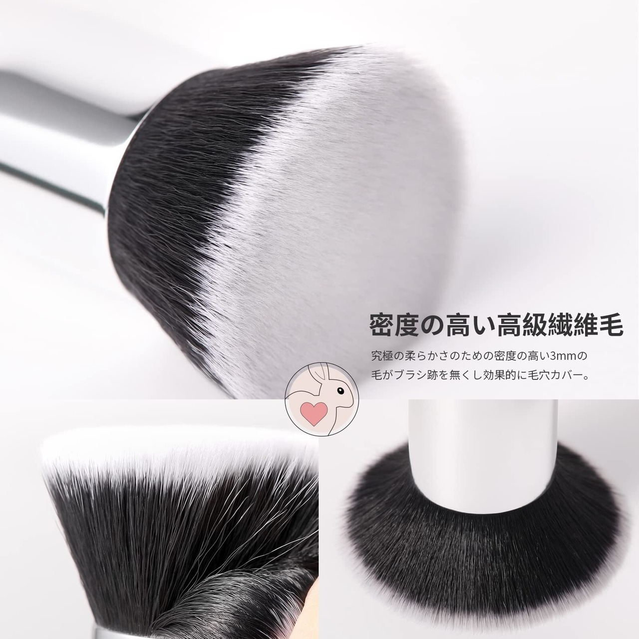 【密度の高い高級繊維毛】究極の柔らかさのための密度の高い3mmの毛がブラシ跡を無くし効果的に毛穴カバー。チクチクしないで、お肌に均等にファンデをのばせます。ベースメイクがとてもキレイに仕上がります。ちゃんとついてるのに、とてもナチュラルで美肌です。