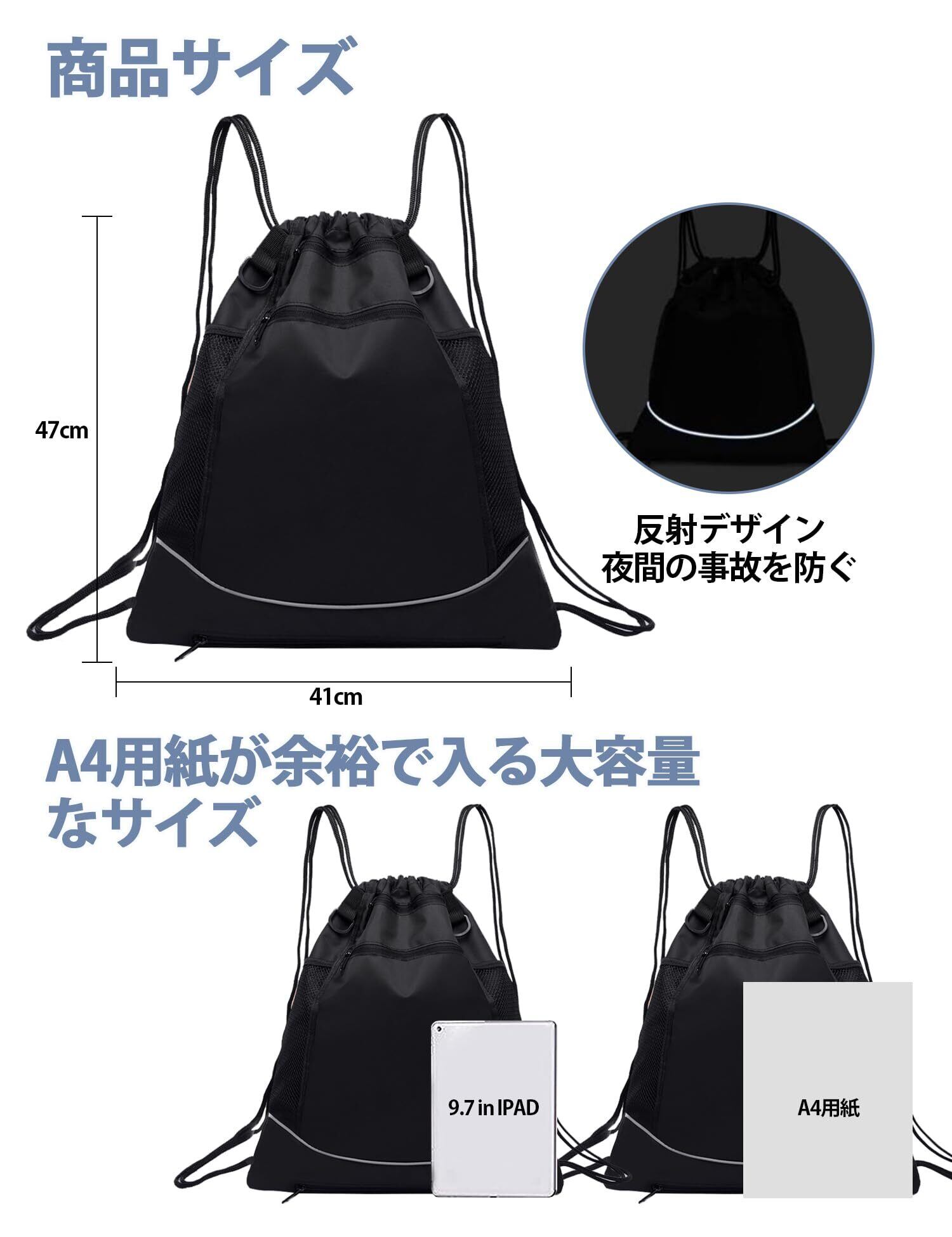 【商品仕様】:リュック:縦47cm×横41cm。メッシュ袋:縦45cm×横38cm。 色:グレー。重量:約0.35KG。本体素材:ポリエステル。