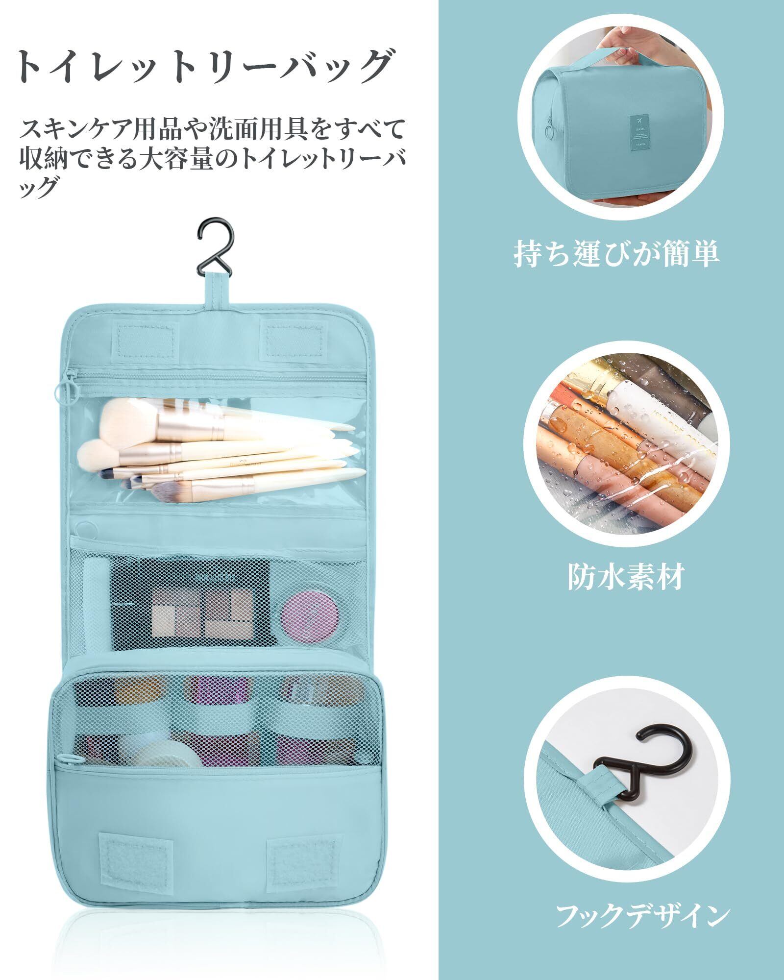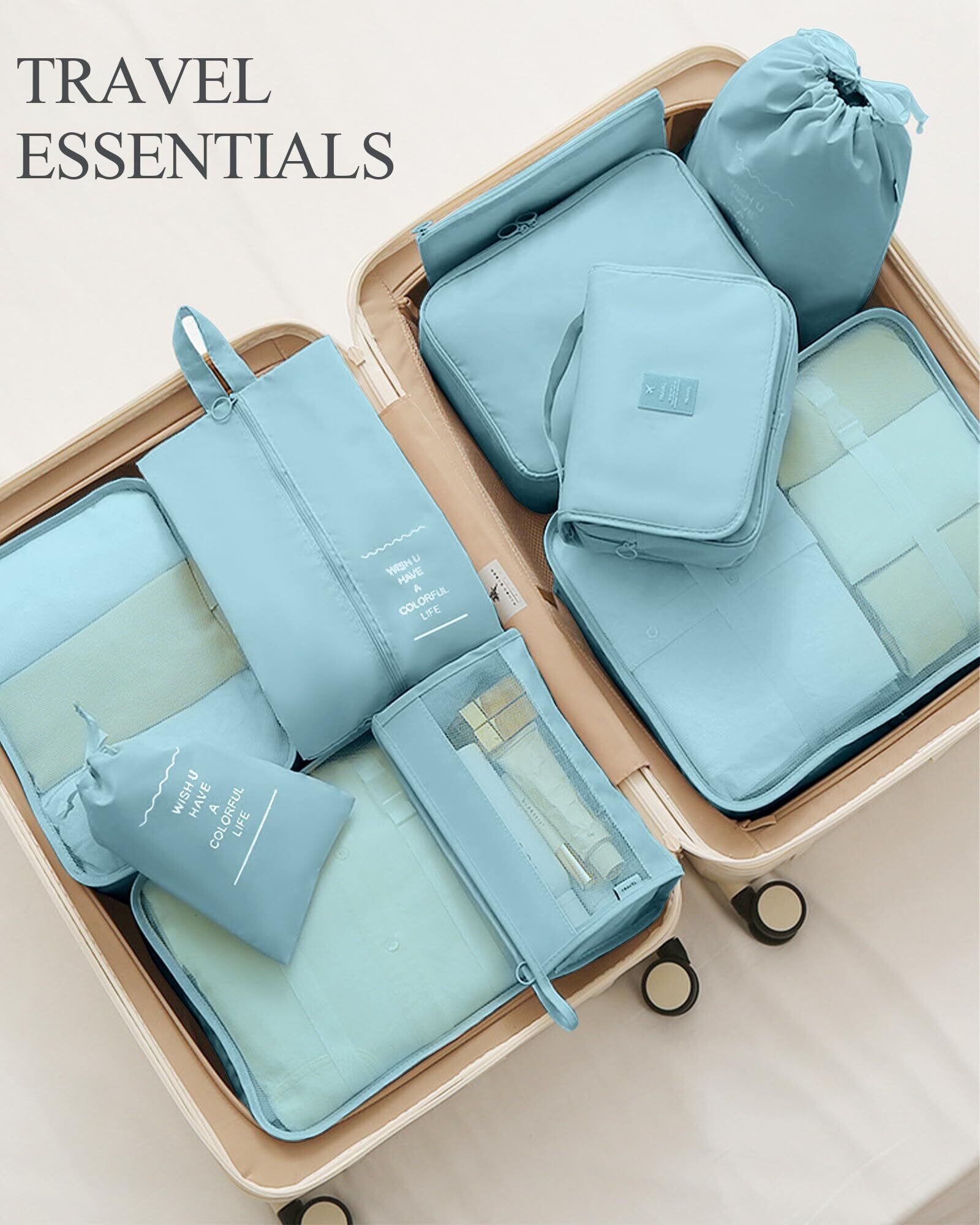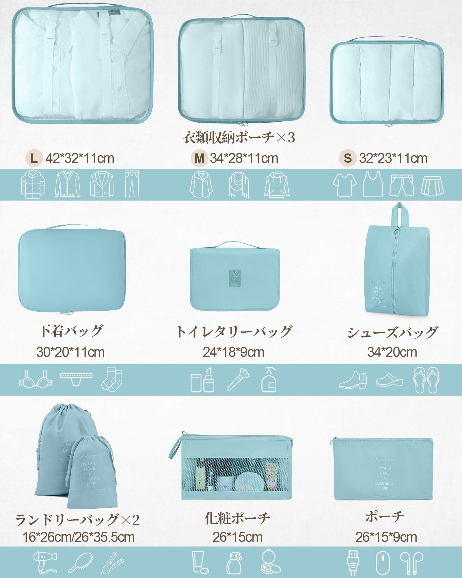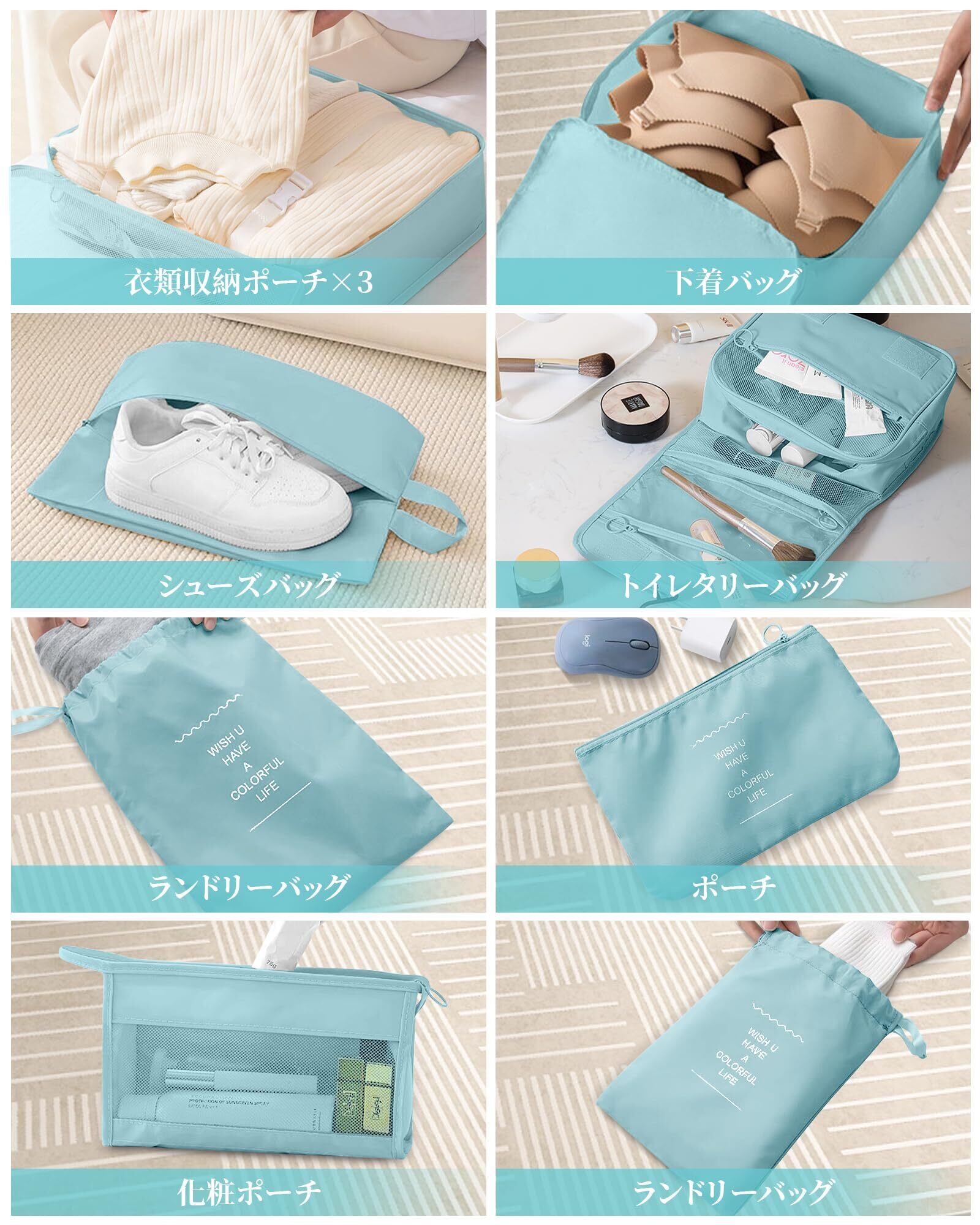 【トラベルポーチ 10セット】衣類収納ポーチ×4、掛け式トイレタリーバッグ×1、シューズバッグ×1、巾着袋×2、メッシュ化粧ポーチx1、ポーチx1。着ていない服衣類や汚れた衣類、洗面用具やシューズなども分けて衛生的に収納できます。スーツケースのなかもすっきりします