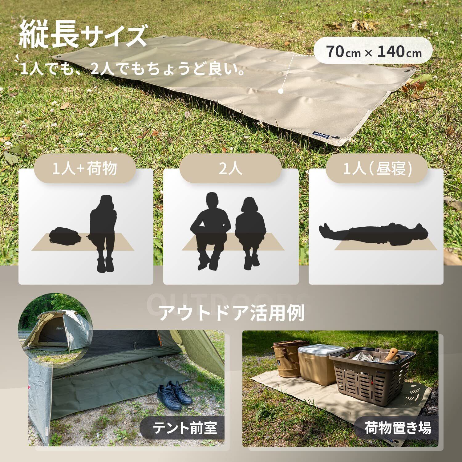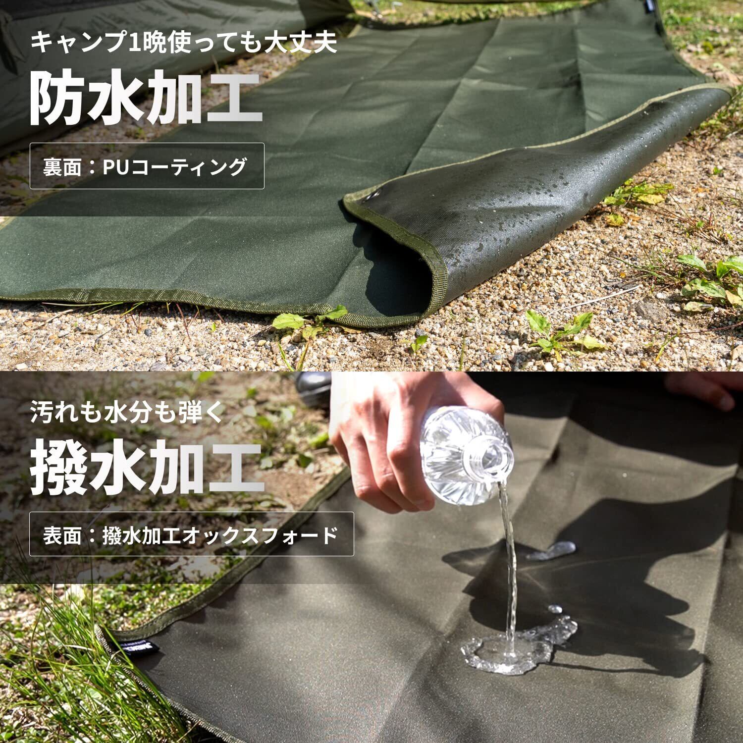 【防水これ1枚でOK】●裏面:キャンプで一晩使っても染みません。ポリウレタンコーティングが地面からの湿気を抑え、裏はびっしょり濡れても表はサラサラをキープ。泥がついても水をかければツルンと簡単に落ちるのでお手入れ簡単です。●表面:撥水性があり、水や汚れをポロポロ弾きます。濡れにくいためシートが水を吸って重くなることも防げます。