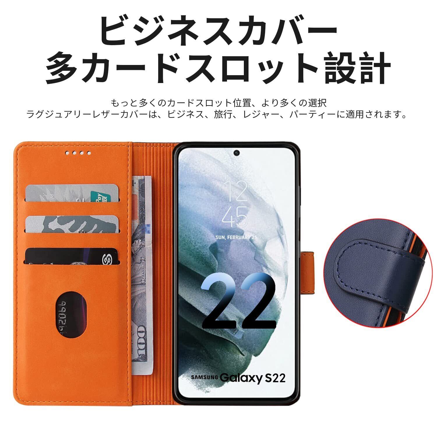 適用型番:Galaxy S22 (6.1インチ) シンプルながらユニークなデザインでレジャーはもちろん、ビジネスにも適しています。