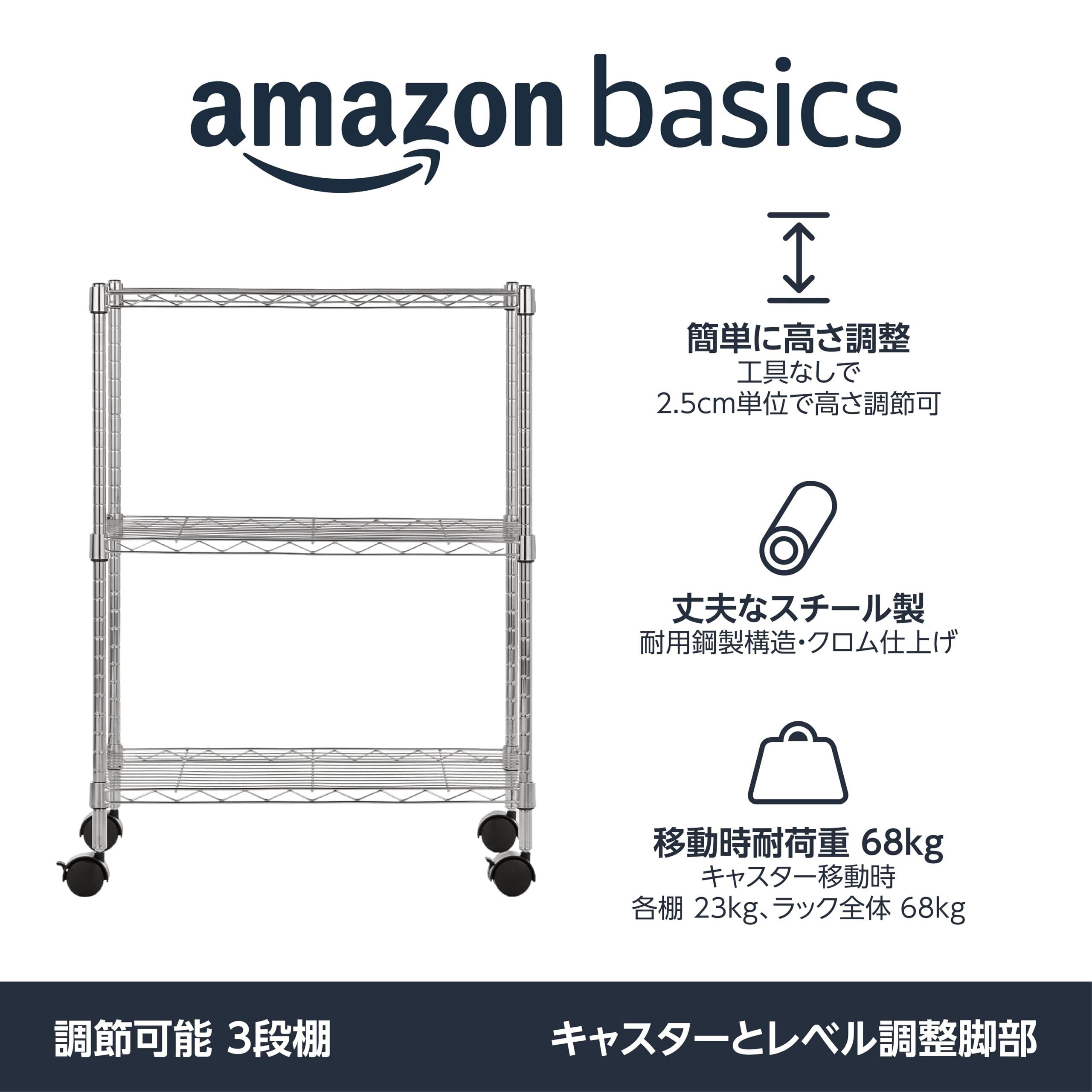 Amazonベーシック 3段スチールラック 棚 メタルラック キッチンラック キャスター付き 耐荷重68kg 幅58.9×奥行34×高さ83cm クロム