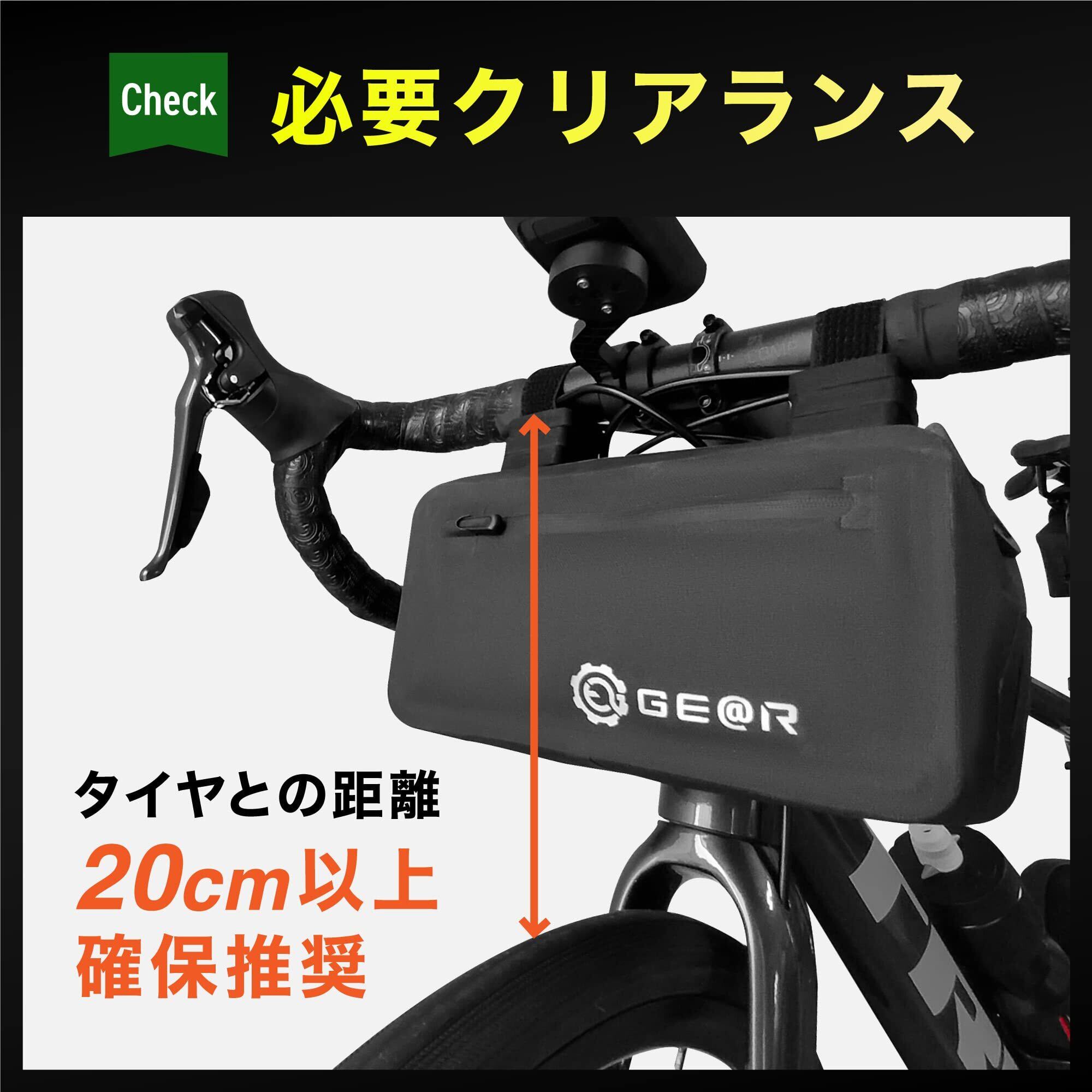 【推奨クリアランス】ハンドルとタイヤの距離が20cm以上あることを確認してください。それ未満だとタイヤと干渉する恐れがあります。フロントキャリアやリアバッグ、サドルバッグなどと一緒に使用する際も、この点に注意してください。
